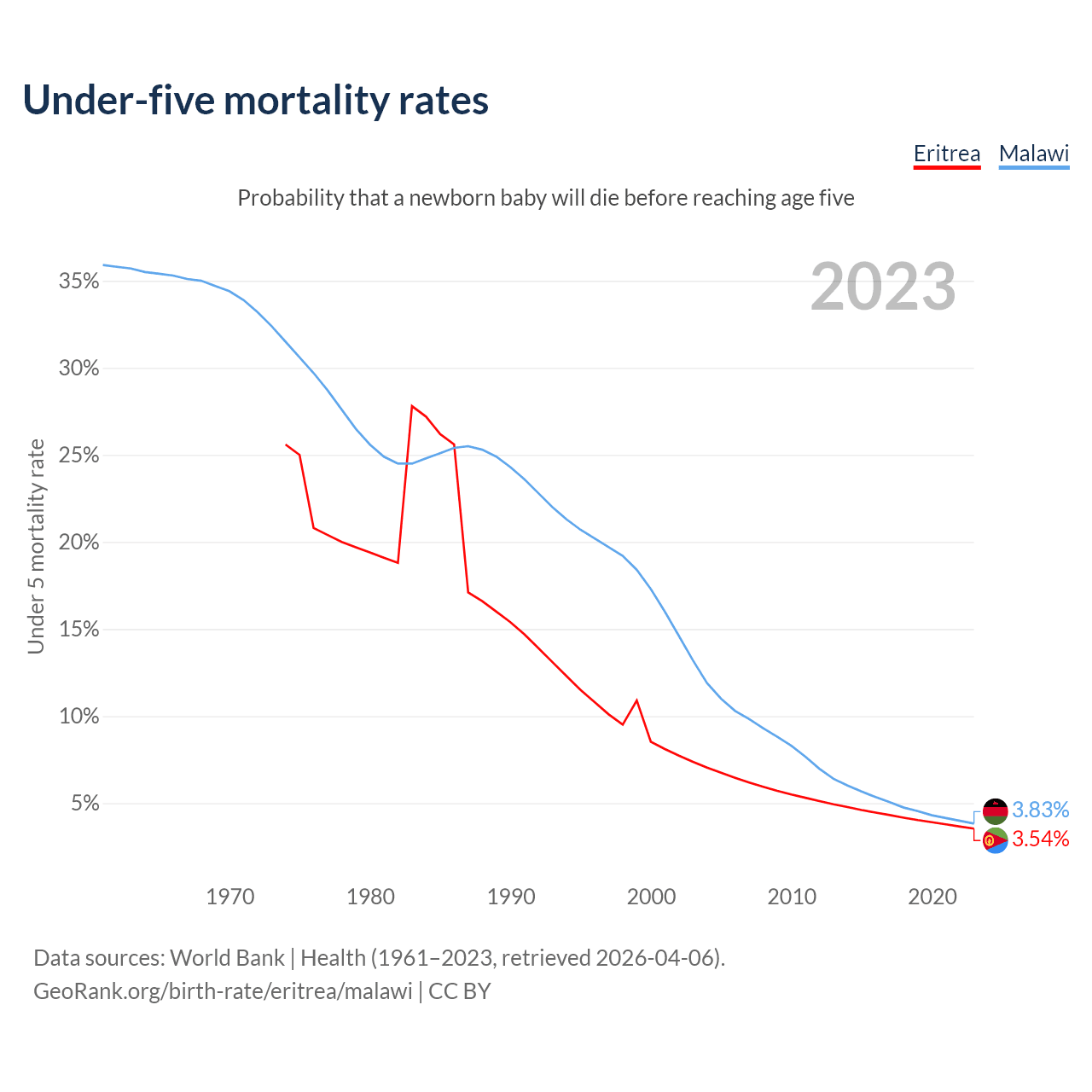 The chance that a newborn baby will die before reaching age five is 3.54% in Eritrea and 3.83% in Malawi. Above is a chart with historical data on under-five mortality rates.