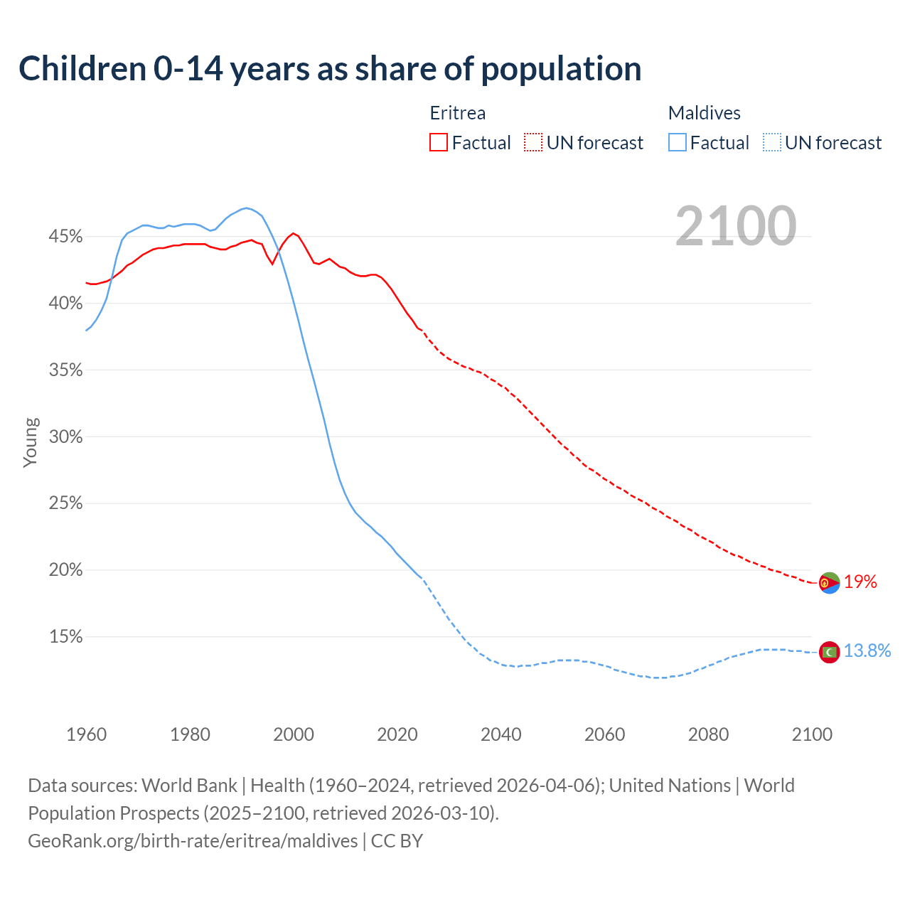 According to the latest available data on birth rates, the fertility rate in Eritrea was 3.71 children per woman in 2023, compared to 1.58 in Maldives in 2023. The replacement level is considered to be 2.1 children per woman.