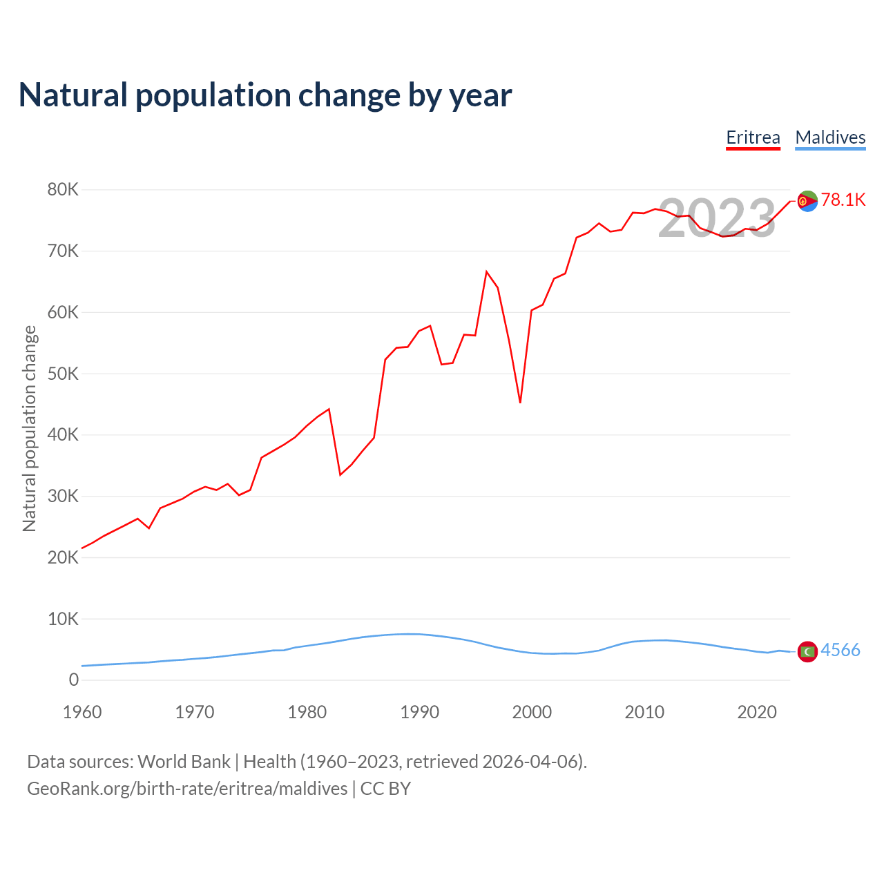 Eritrea has an annual birth rate of 28.5 births per 1,000 people, compared to 11 for Maldives. The average number of children a woman is expected to have during her lifetime — the fertility rate, is 3.71 in Eritrea and 1.58 in Maldives — 57.6% difference.