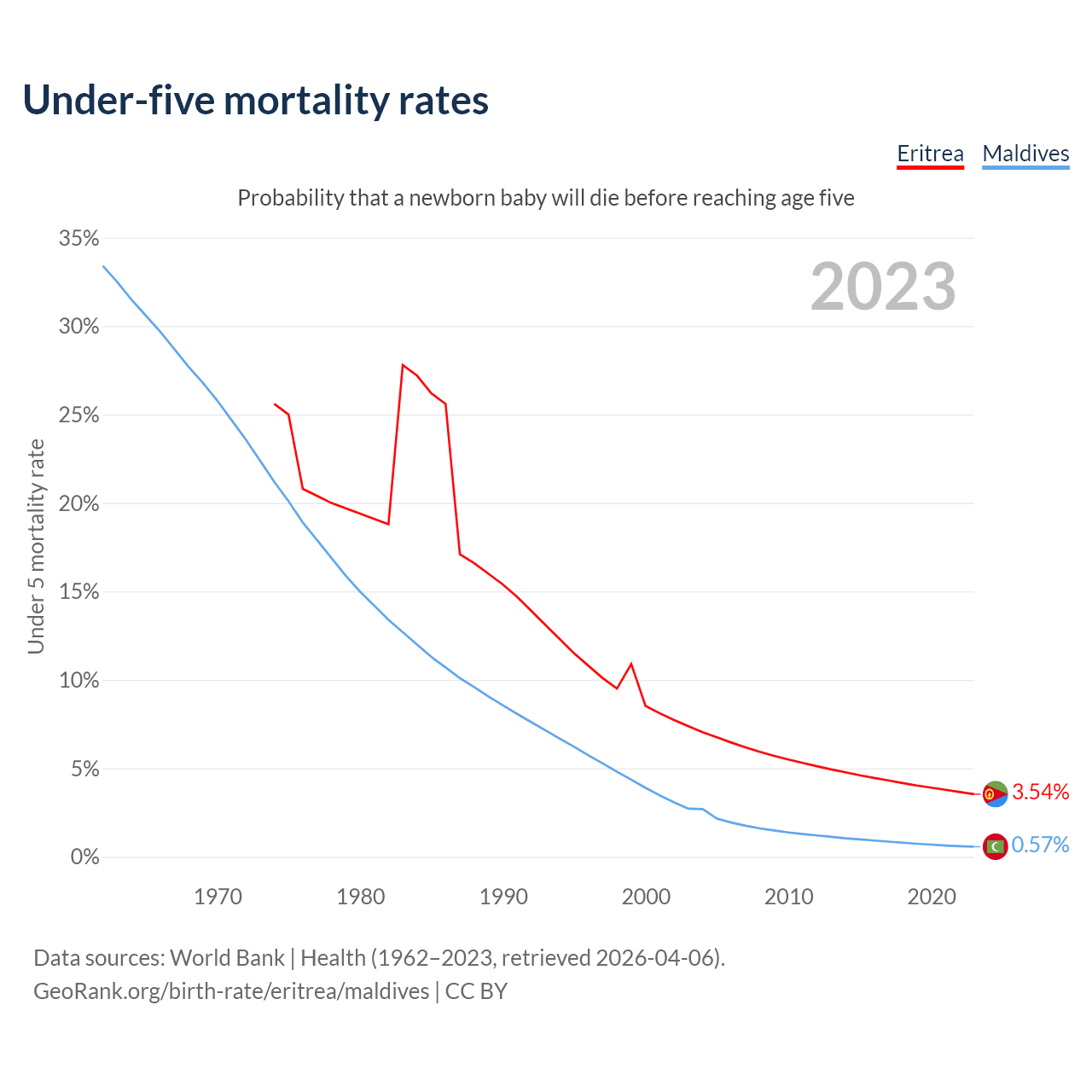 The chance that a newborn baby will die before reaching age five is 3.54% in Eritrea and 0.57% in Maldives. Above is a chart with historical data on under-five mortality rates.