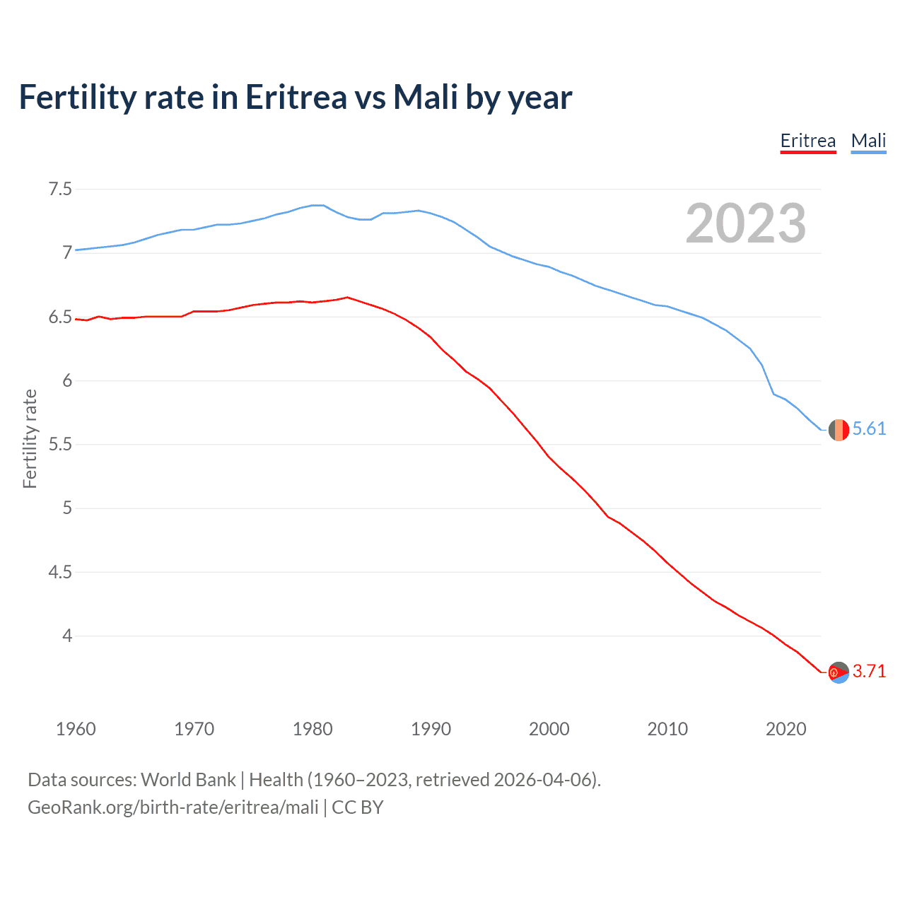 1960 vs 2023, the fertility rate has decreased by 42.7% in Eritrea and by 20% in Mali — in 1960, it was 6.48 and 7.02, respectively.