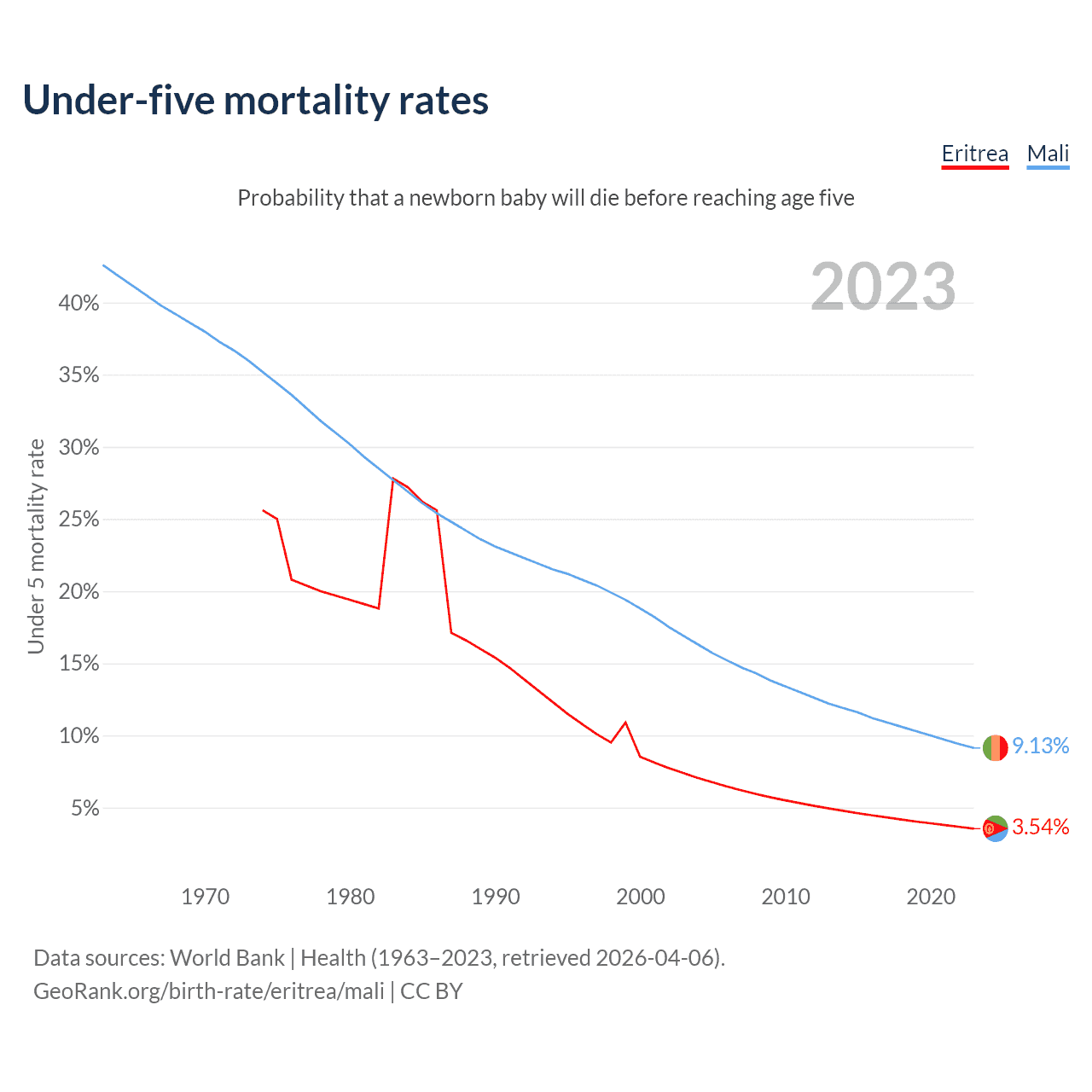 The chance that a newborn baby will die before reaching age five is 3.54% in Eritrea and 9.13% in Mali. Above is a chart with historical data on under-five mortality rates.