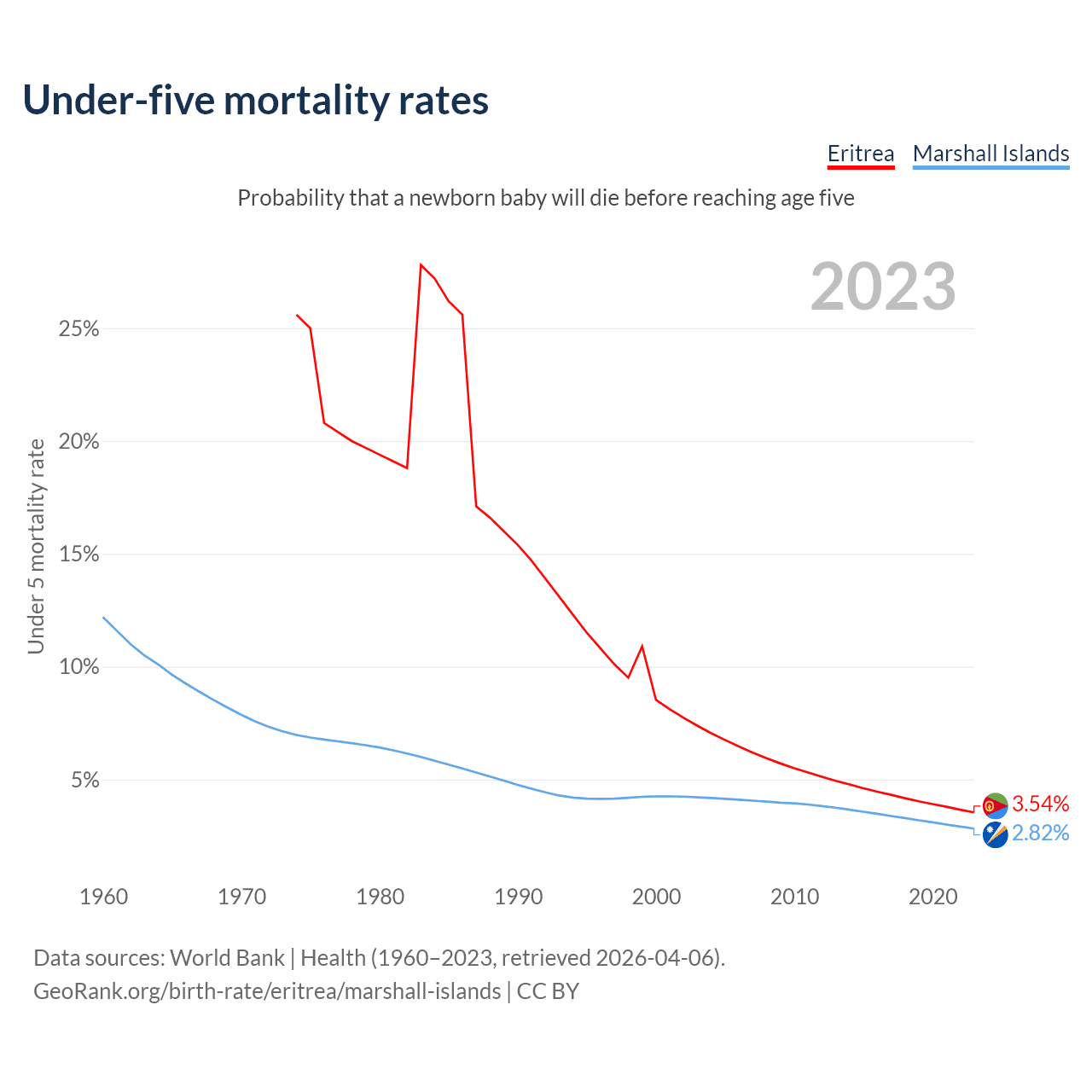 The chance that a newborn baby will die before reaching age five is 3.54% in Eritrea and 2.82% in the Marshall Islands. Above is a chart with historical data on under-five mortality rates.