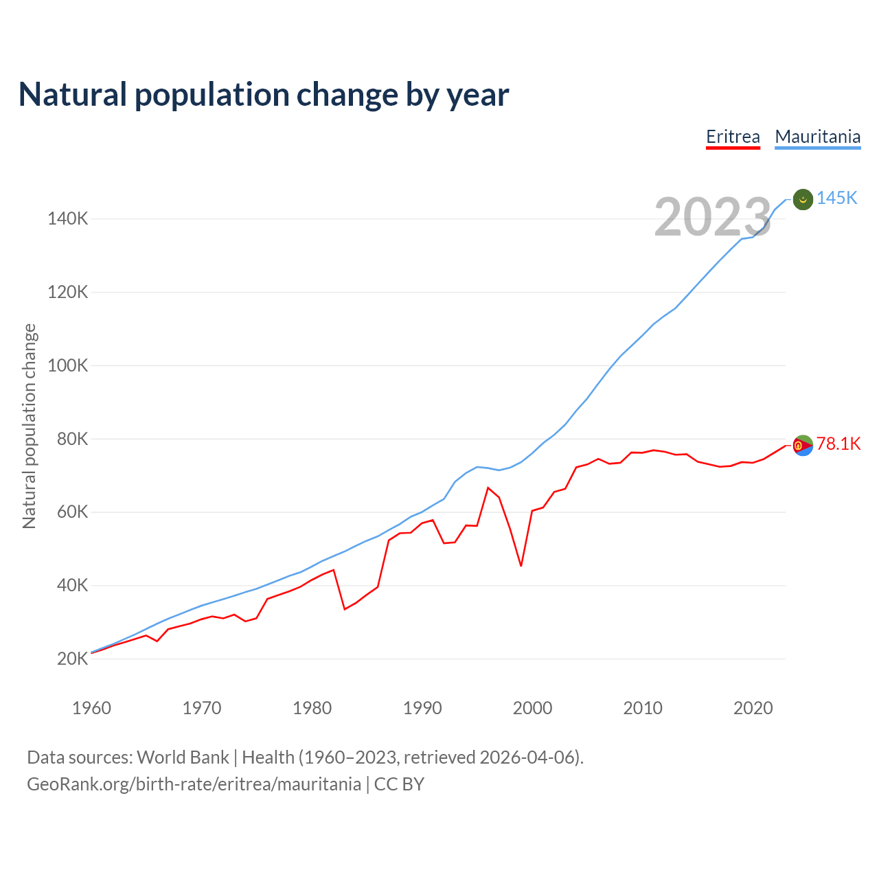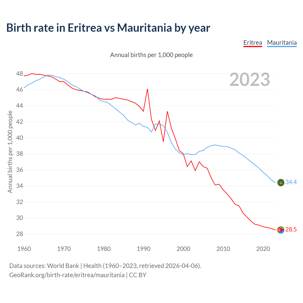 Eritrea has an annual birth rate of 28.5 births per 1,000 people, compared to 34.4 for Mauritania. The average number of children a woman is expected to have during her lifetime — the fertility rate, is 3.71 in Eritrea and 4.7 in Mauritania — 26.5% difference.