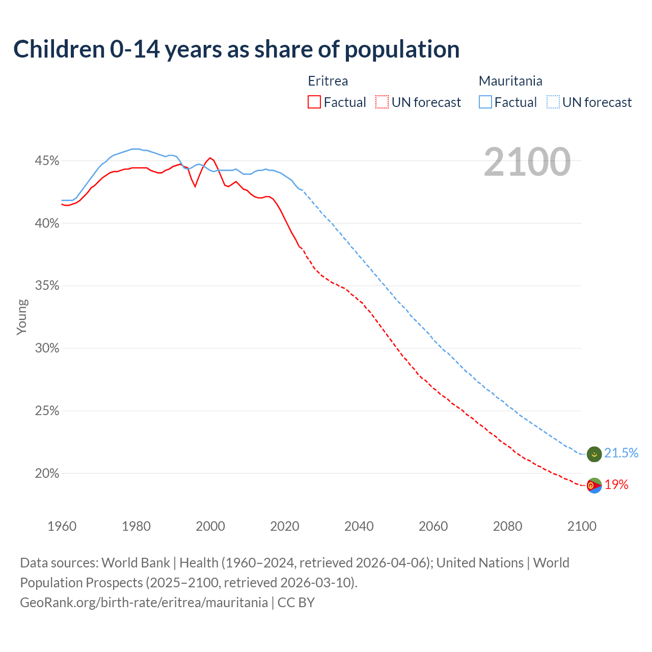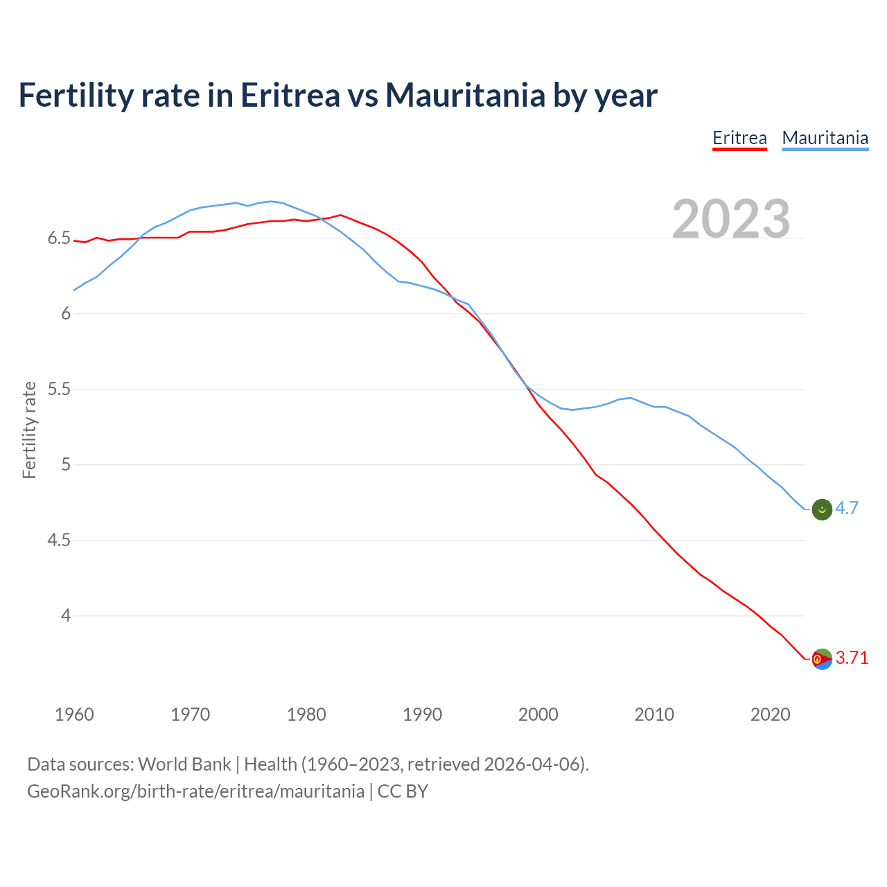 According to the latest available data on birth rates, the fertility rate in Eritrea was 3.71 children per woman in 2023, compared to 4.7 in Mauritania in 2023. The replacement level is considered to be 2.1 children per woman.