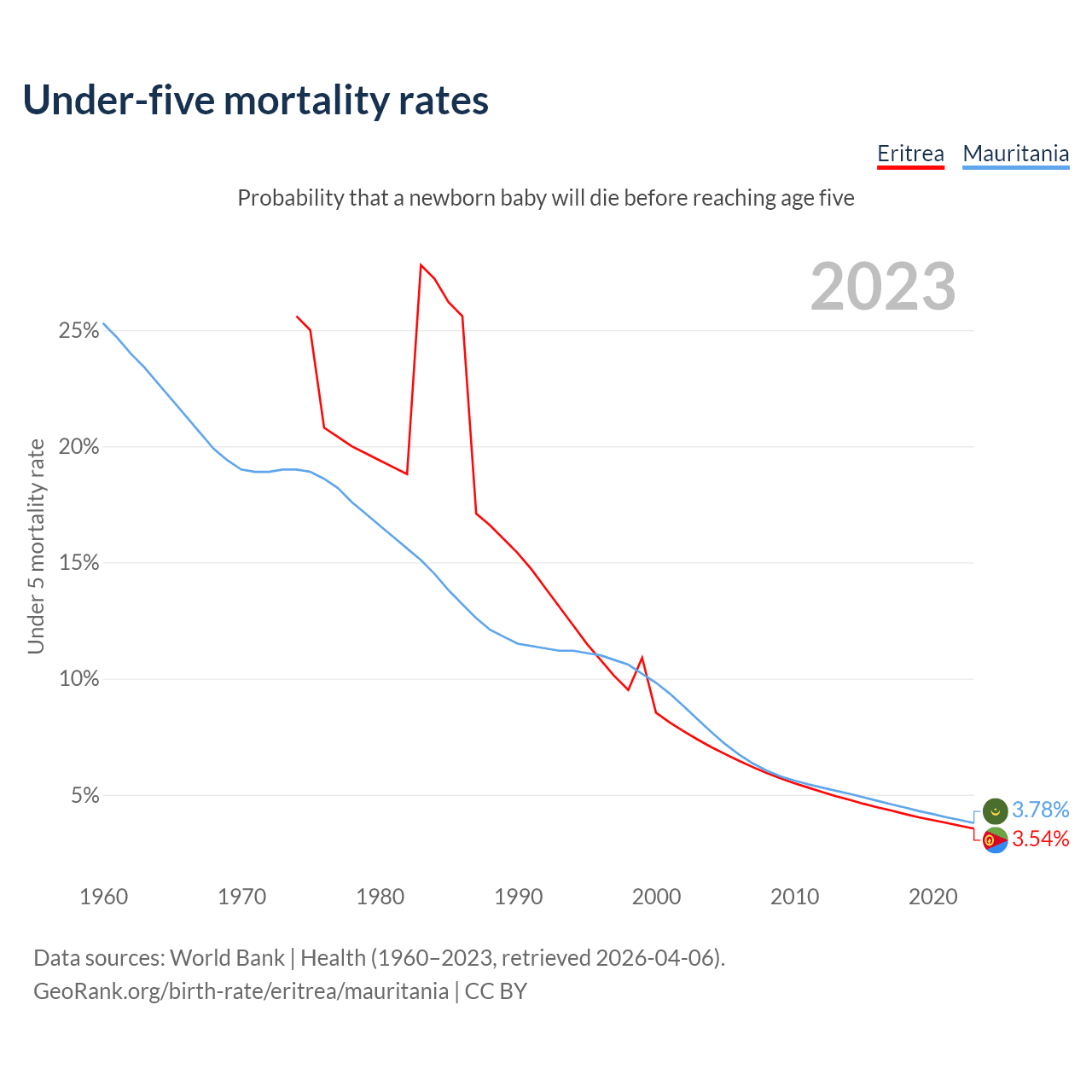 The chance that a newborn baby will die before reaching age five is 3.54% in Eritrea and 3.78% in Mauritania. Above is a chart with historical data on under-five mortality rates.