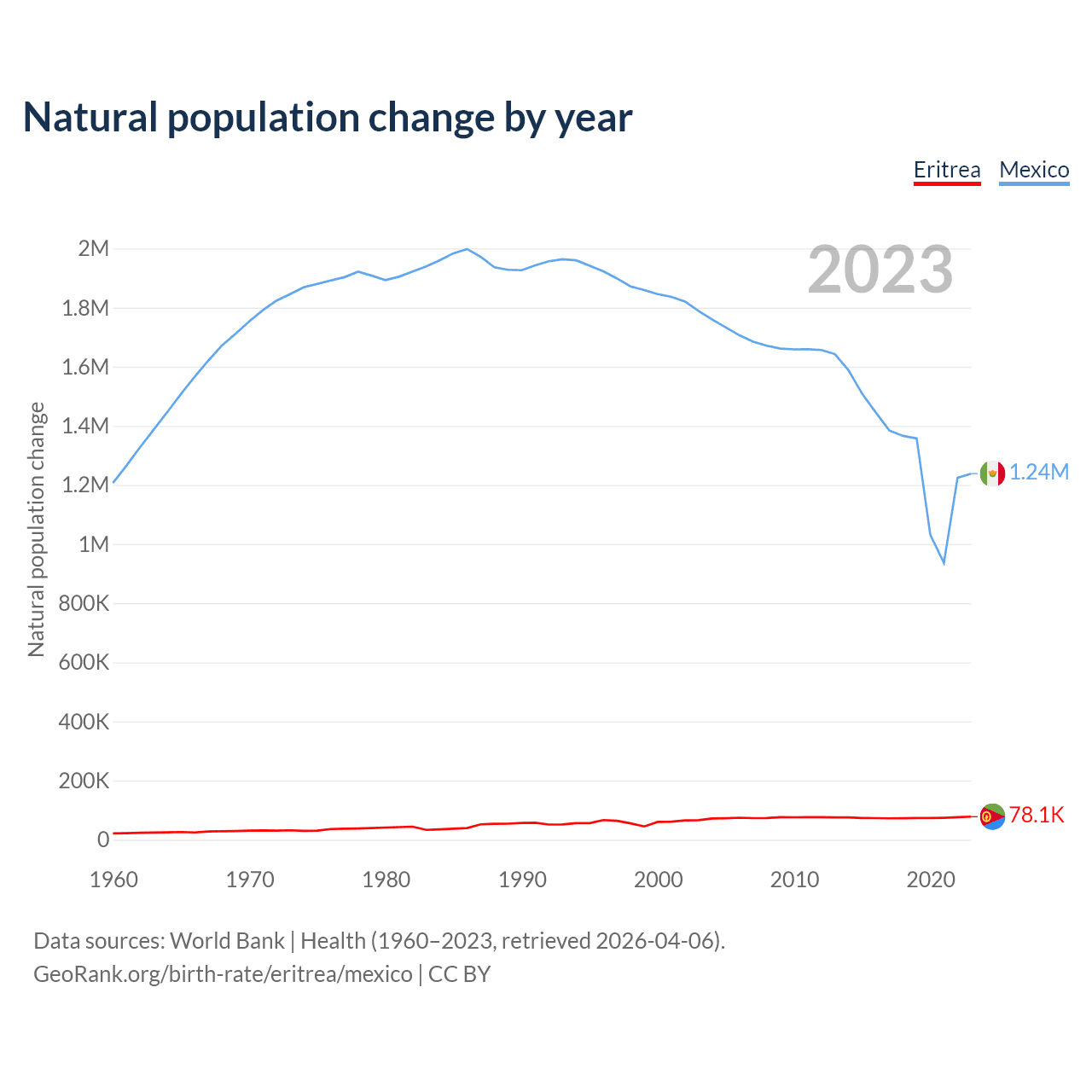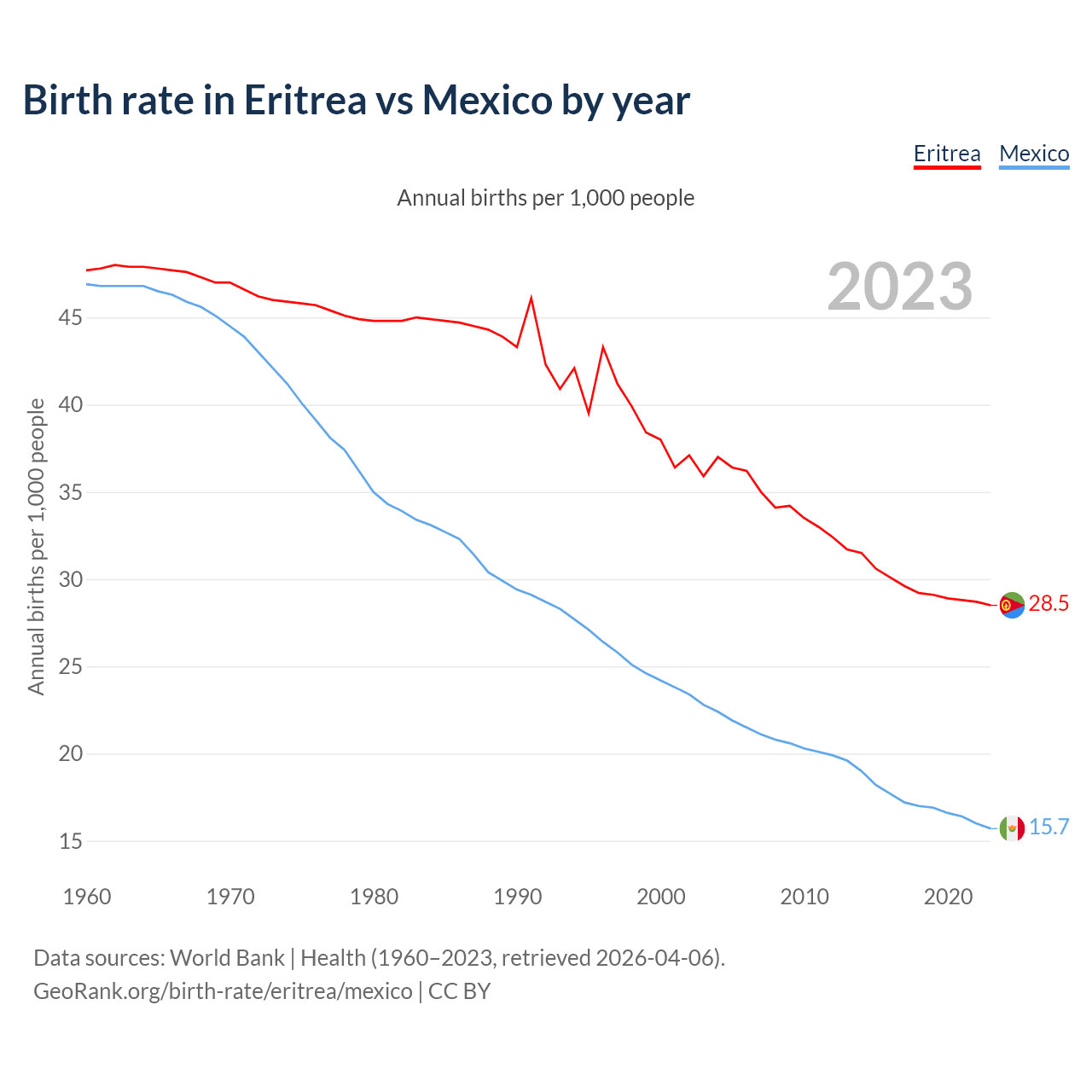 Eritrea has an annual birth rate of 28.5 births per 1,000 people, compared to 15.7 for Mexico. The average number of children a woman is expected to have during her lifetime — the fertility rate, is 3.71 in Eritrea and 1.91 in Mexico — 48.6% difference.