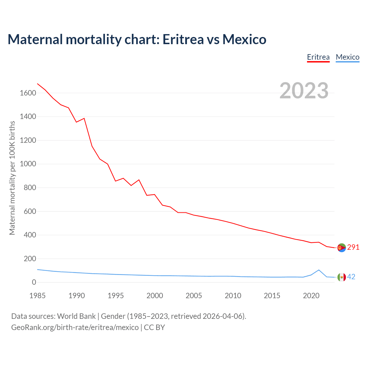 - Annual births per 1,000 women ages 15-19 (adolescent birth rate or teenage mother rate) is 65.2 in Eritrea vs 60.1 in Mexico.