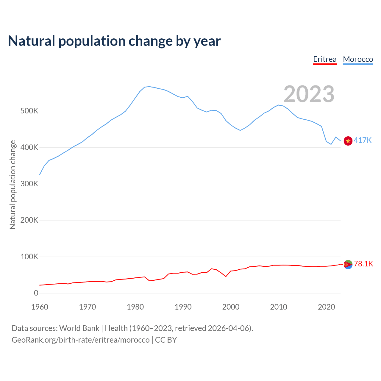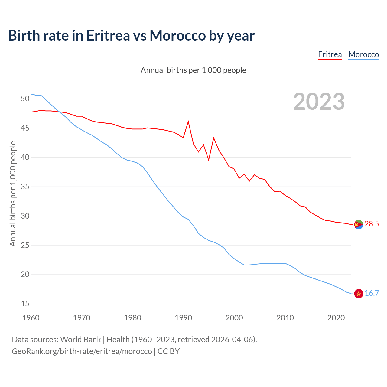 Eritrea has an annual birth rate of 28.5 births per 1,000 people, compared to 16.7 for Morocco. The average number of children a woman is expected to have during her lifetime — the fertility rate, is 3.71 in Eritrea and 2.23 in Morocco — 39.9% difference.
