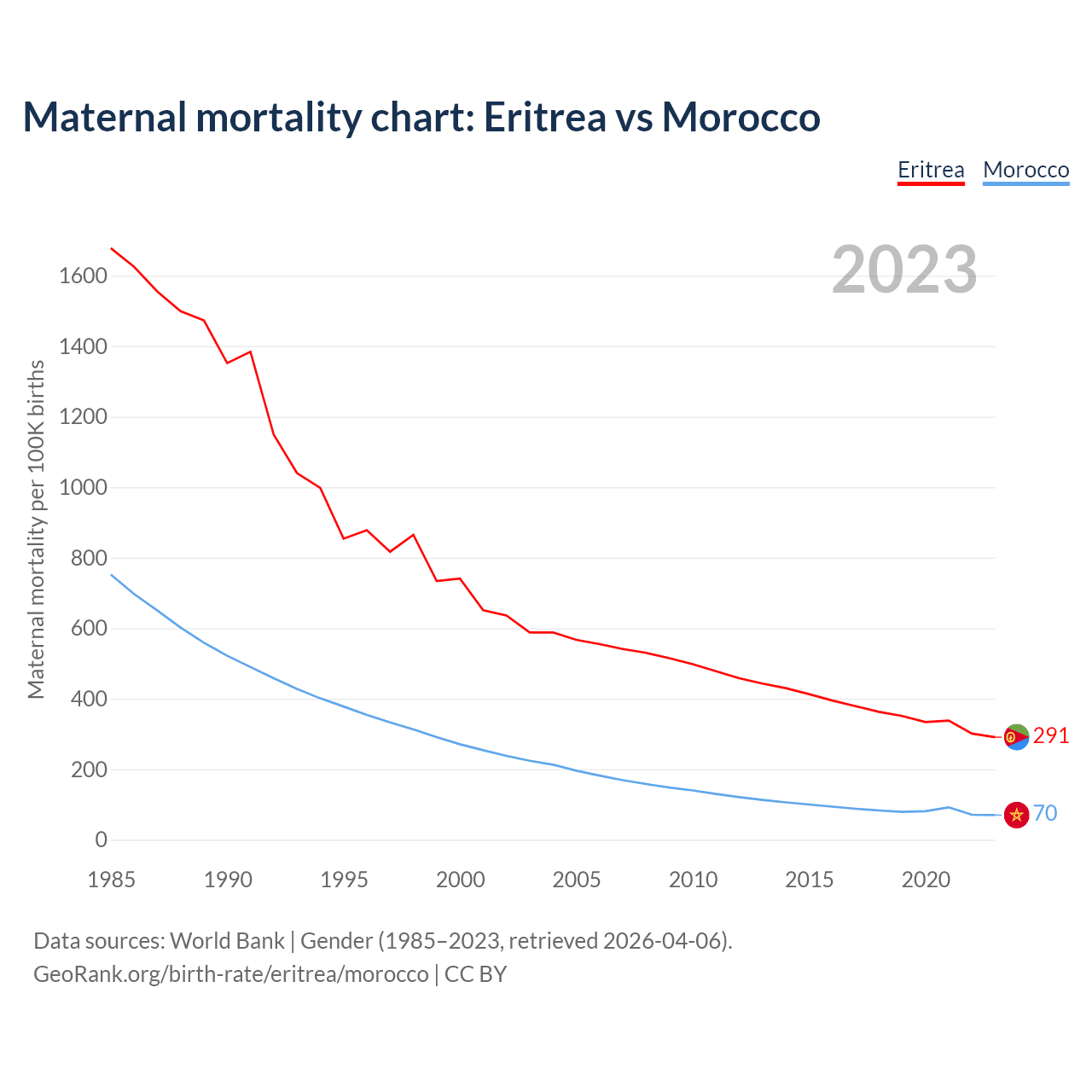 The maternal mortality rate, which is the probability of dying during childbirth or within 42 days of pregnancy termination, is 291 deaths per 100,000 live births in Eritrea, compared to 70 deaths in Morocco.