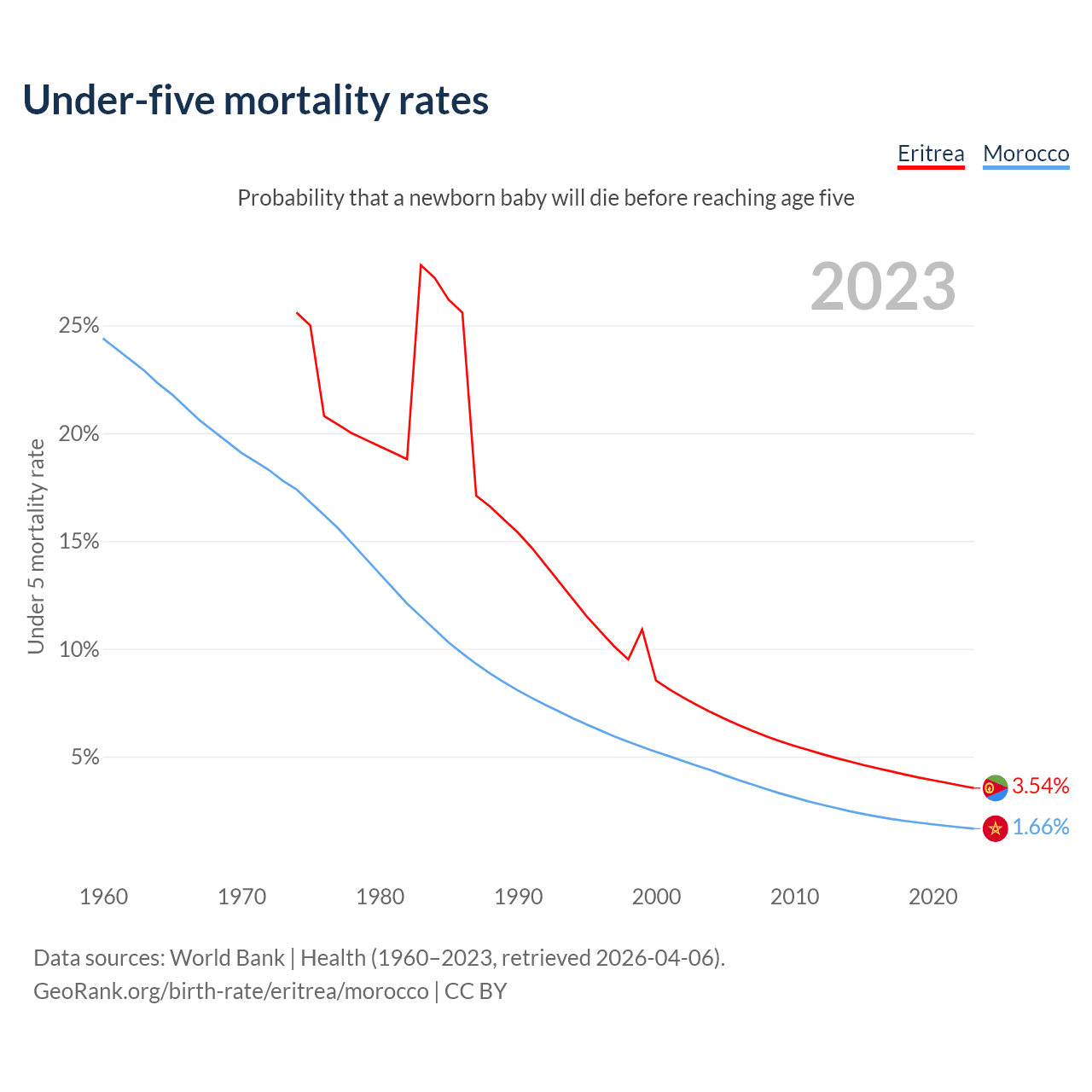 The chance that a newborn baby will die before reaching age five is 3.54% in Eritrea and 1.66% in Morocco. Above is a chart with historical data on under-five mortality rates.
