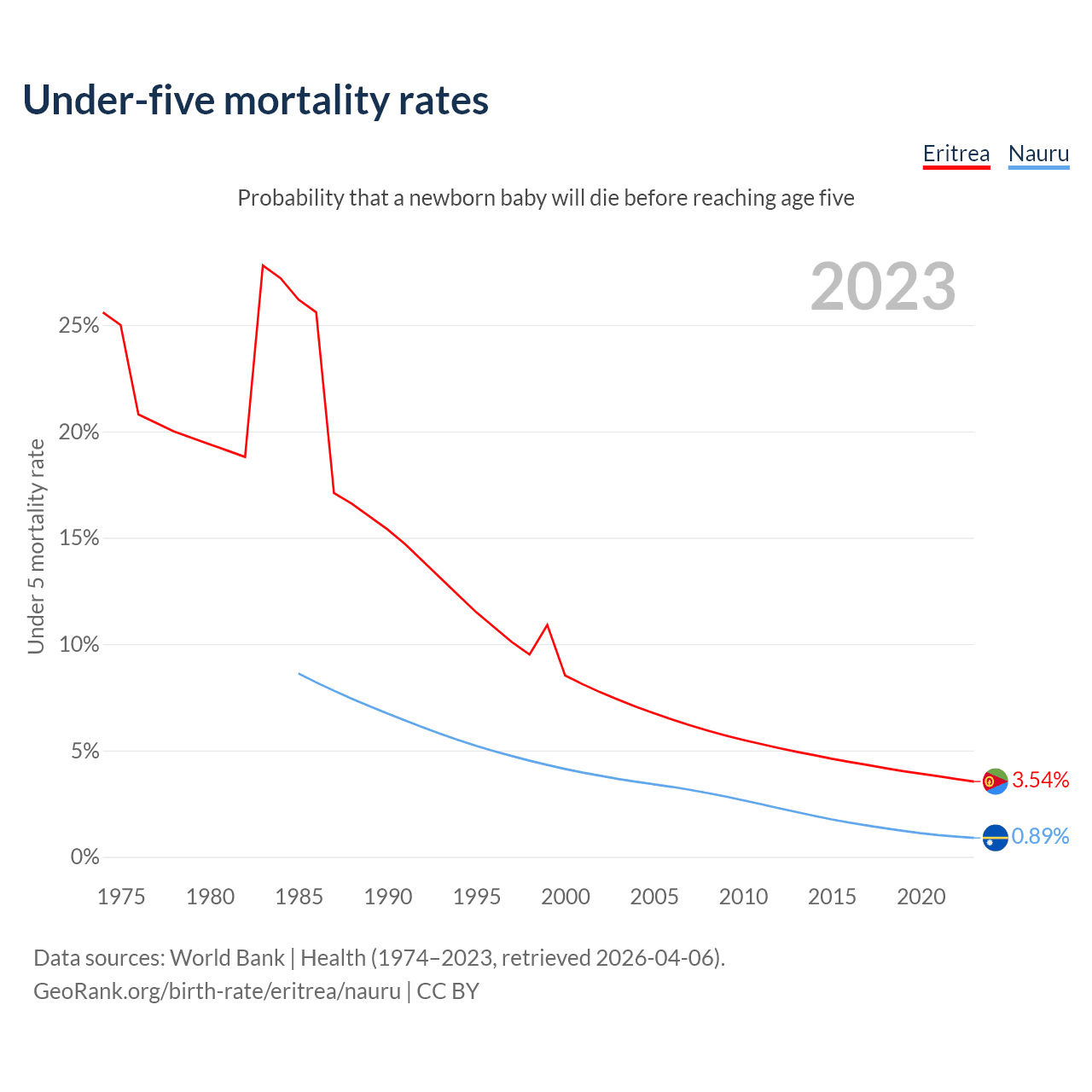 The chance that a newborn baby will die before reaching age five is 3.54% in Eritrea and 0.89% in Nauru. Above is a chart with historical data on under-five mortality rates.