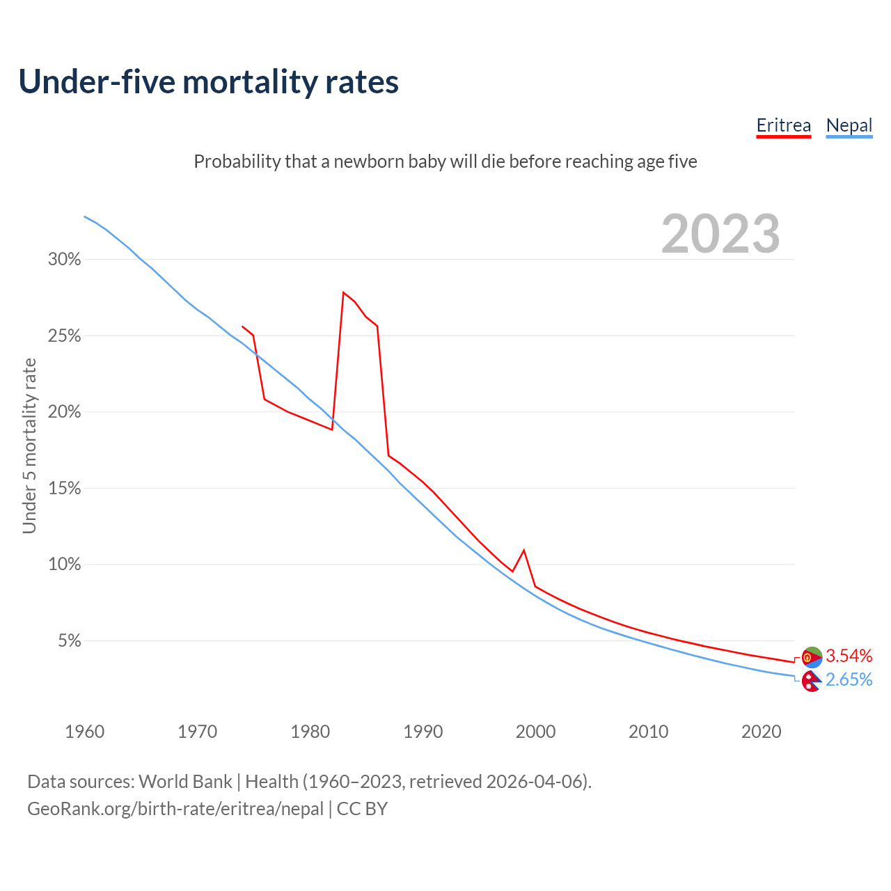The chance that a newborn baby will die before reaching age five is 3.54% in Eritrea and 2.65% in Nepal. Above is a chart with historical data on under-five mortality rates.
