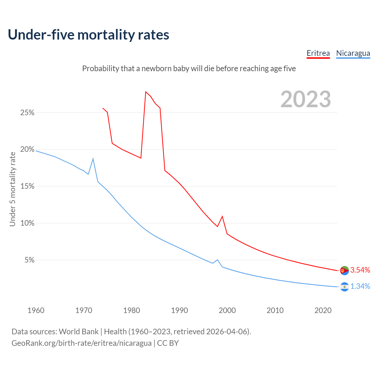 The chance that a newborn baby will die before reaching age five is 3.54% in Eritrea and 1.34% in Nicaragua. Above is a chart with historical data on under-five mortality rates.