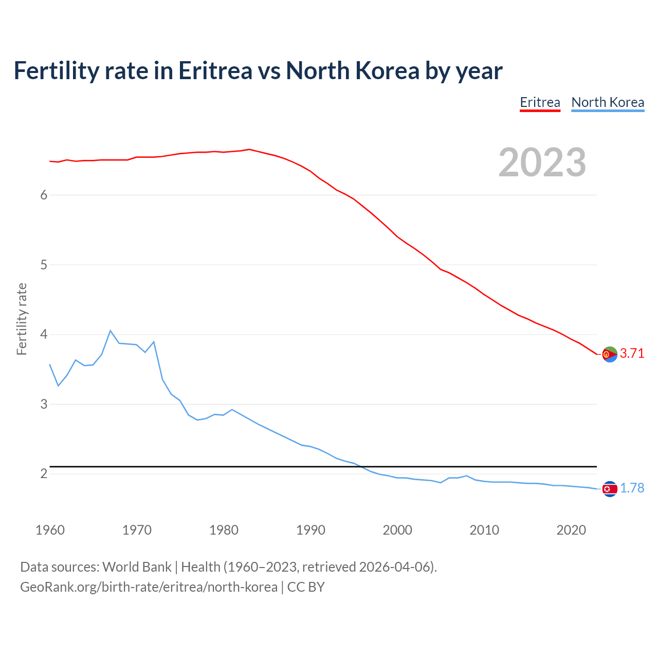 According to the latest available data on birth rates, the fertility rate in Eritrea was 3.71 children per woman in 2023, compared to 1.78 in North Korea in 2023. The replacement level is considered to be 2.1 children per woman.