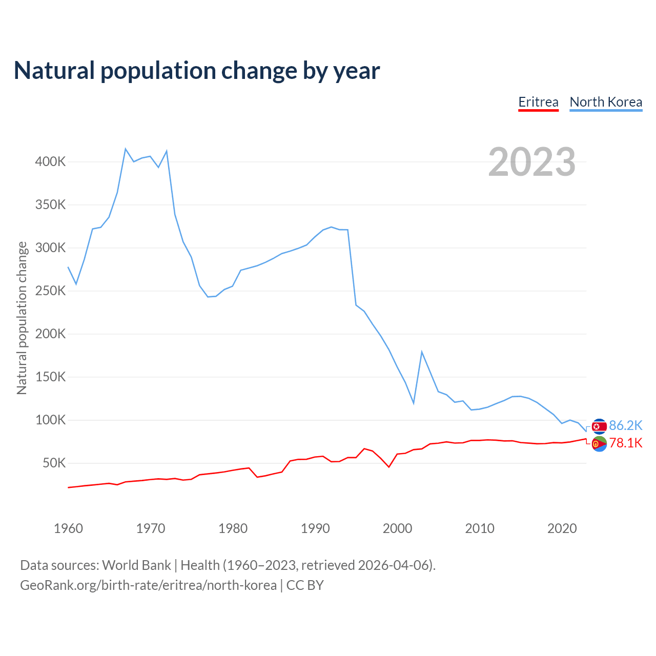 Eritrea has an annual birth rate of 28.5 births per 1,000 people, compared to 12.9 for North Korea. The average number of children a woman is expected to have during her lifetime — the fertility rate, is 3.71 in Eritrea and 1.78 in North Korea — 52.1% difference.