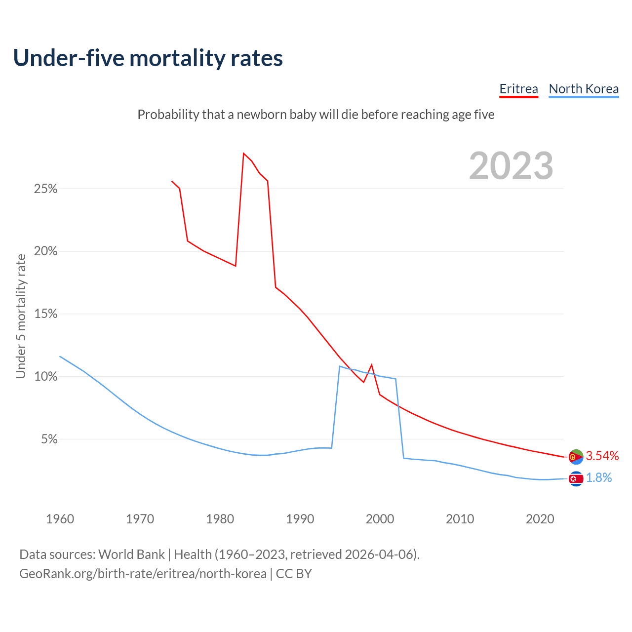 The chance that a newborn baby will die before reaching age five is 3.54% in Eritrea and 1.8% in North Korea. Above is a chart with historical data on under-five mortality rates.