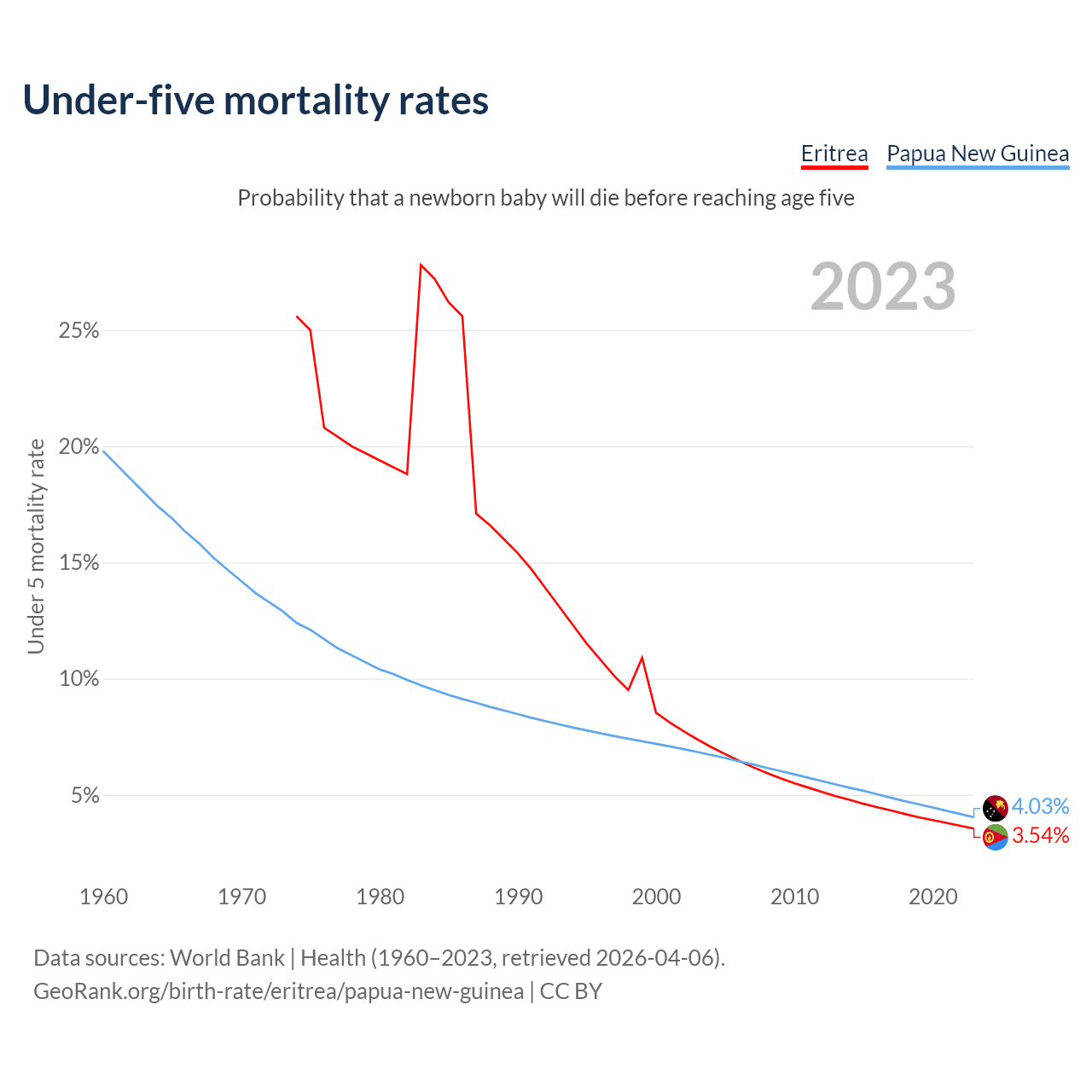 The chance that a newborn baby will die before reaching age five is 3.54% in Eritrea and 4.03% in Papua New Guinea. Above is a chart with historical data on under-five mortality rates.
