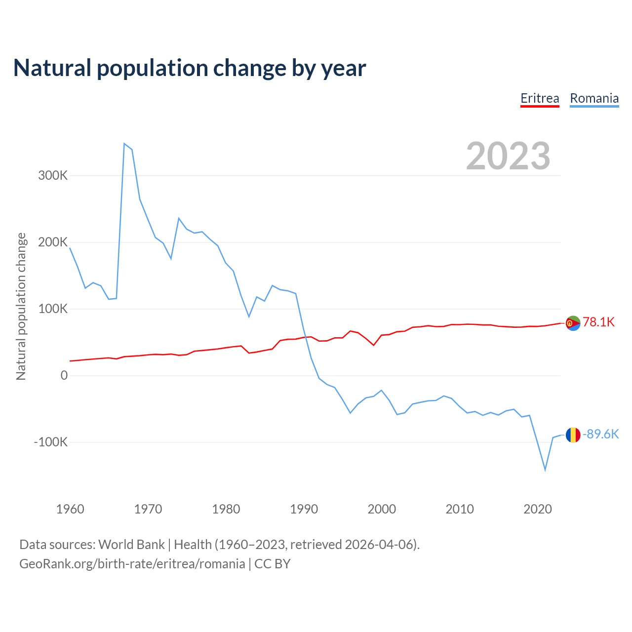 Eritrea has an annual birth rate of 28.5 births per 1,000 people, compared to 8 for Romania. The average number of children a woman is expected to have during her lifetime — the fertility rate, is 3.71 in Eritrea and 1.71 in Romania — 53.9% difference.