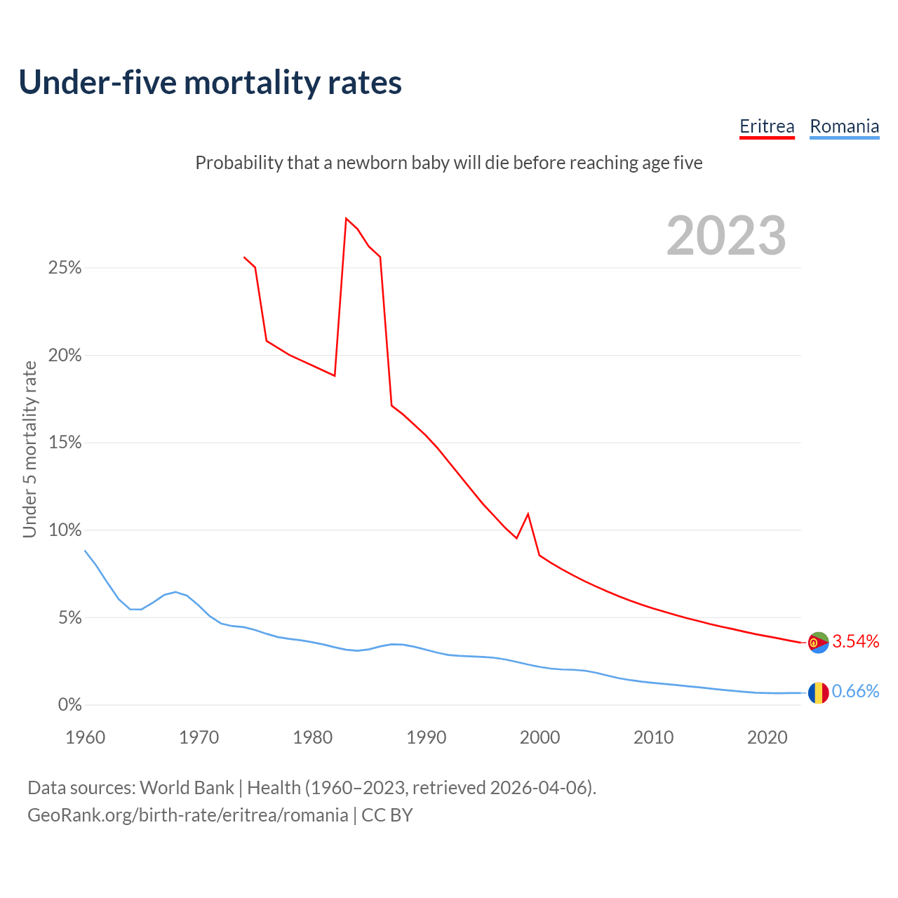 The chance that a newborn baby will die before reaching age five is 3.54% in Eritrea and 0.66% in Romania. Above is a chart with historical data on under-five mortality rates.