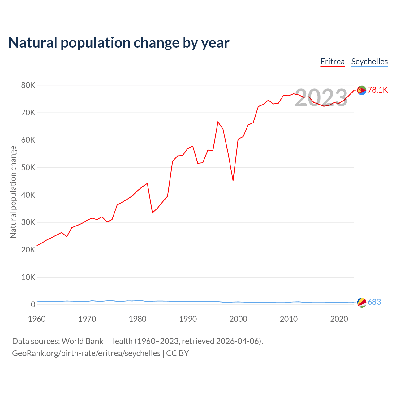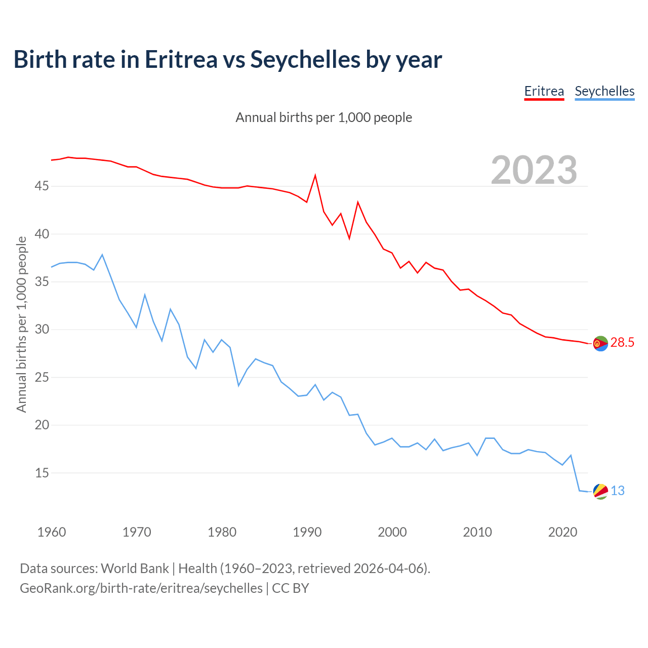 Eritrea has an annual birth rate of 28.5 births per 1,000 people, compared to 13 for the Seychelles. The average number of children a woman is expected to have during her lifetime — the fertility rate, is 3.71 in Eritrea and 2.02 in the Seychelles — 45.6% difference.