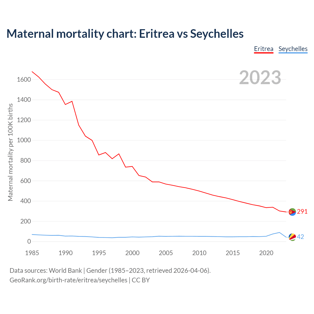 - Annual births per 1,000 women ages 15-19 (adolescent birth rate or teenage mother rate) is 65.2 in Eritrea vs 54.5 in the Seychelles.