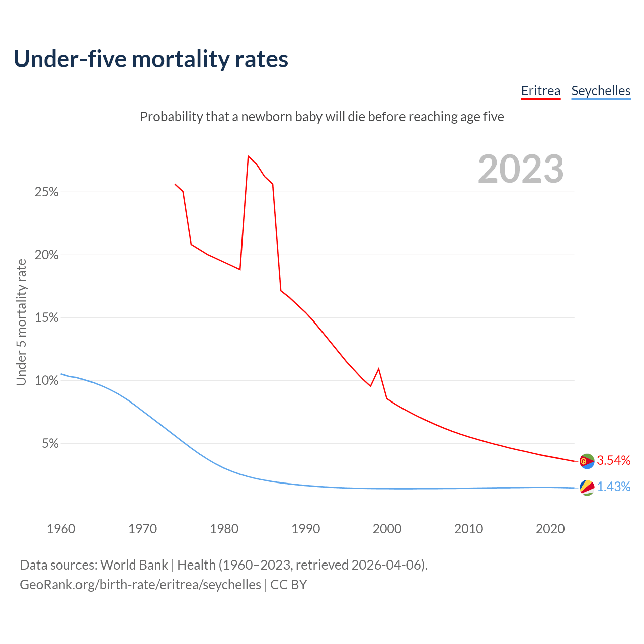 The chance that a newborn baby will die before reaching age five is 3.54% in Eritrea and 1.43% in the Seychelles. Above is a chart with historical data on under-five mortality rates.