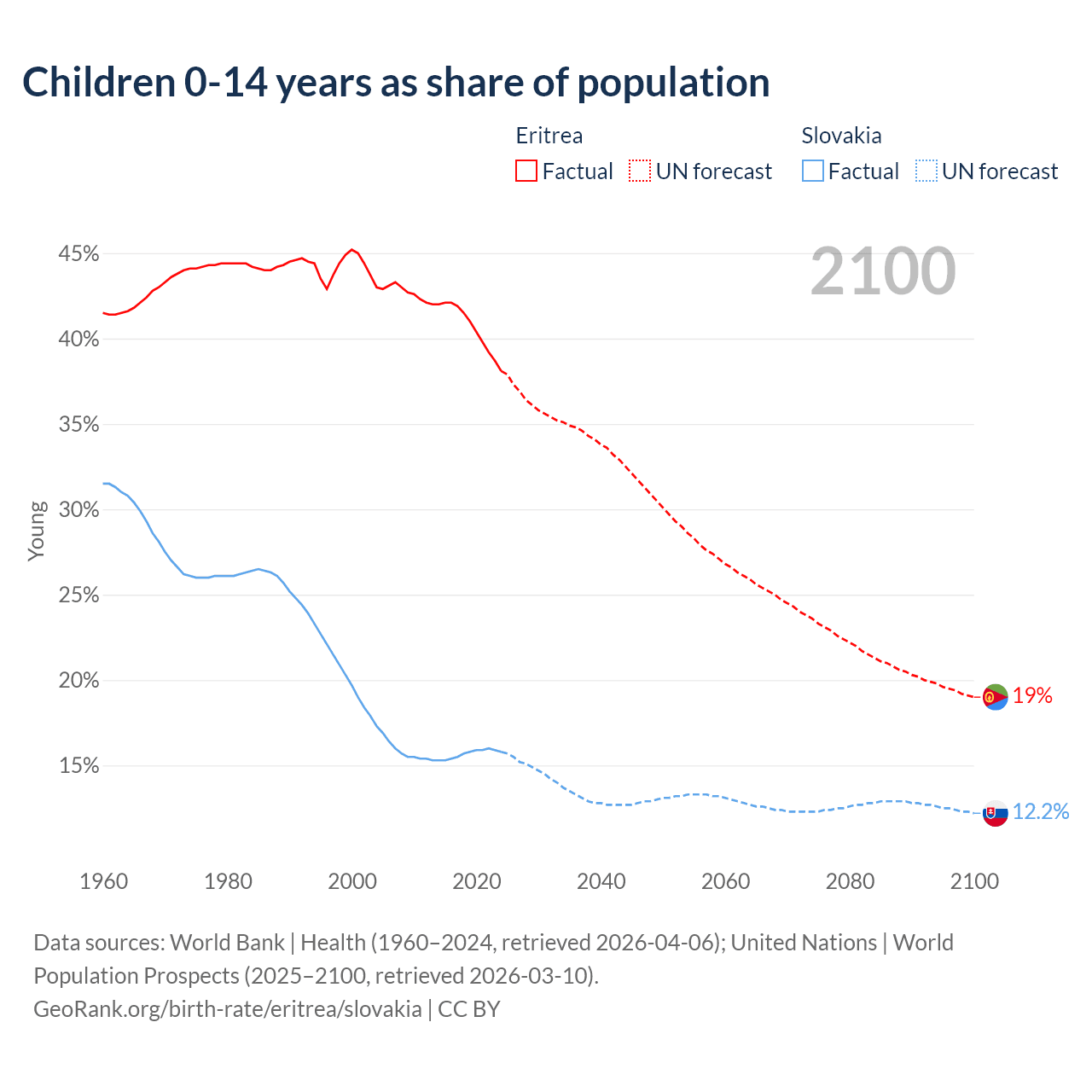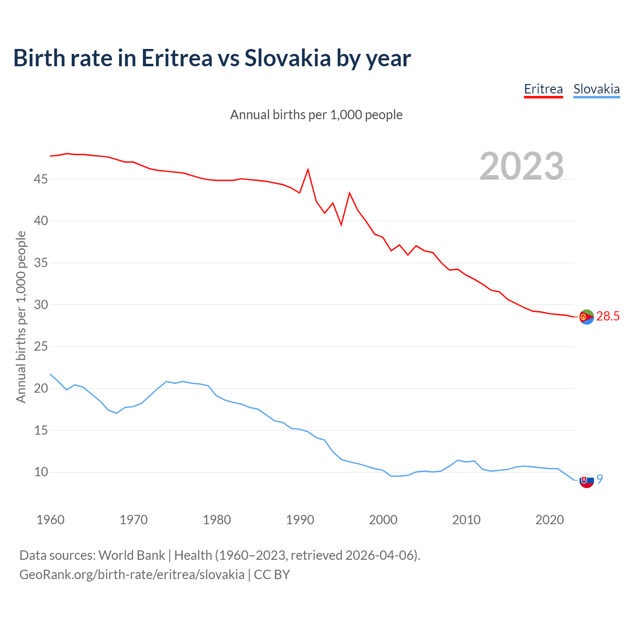 Eritrea has an annual birth rate of 28.5 births per 1,000 people, compared to 9 for Slovakia. The average number of children a woman is expected to have during her lifetime — the fertility rate, is 3.71 in Eritrea and 1.49 in Slovakia — 59.9% difference.