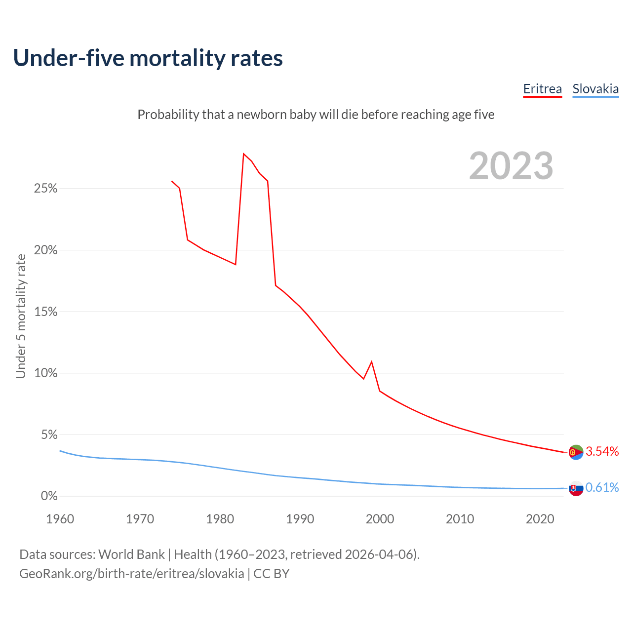 The chance that a newborn baby will die before reaching age five is 3.54% in Eritrea and 0.61% in Slovakia. Above is a chart with historical data on under-five mortality rates.