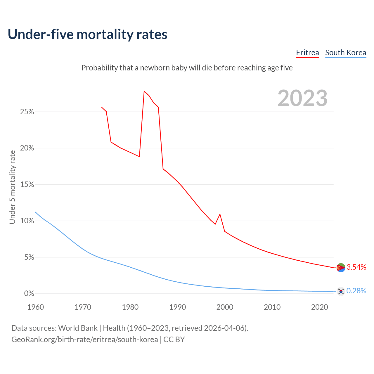 The chance that a newborn baby will die before reaching age five is 3.54% in Eritrea and 0.28% in South Korea. Above is a chart with historical data on under-five mortality rates.