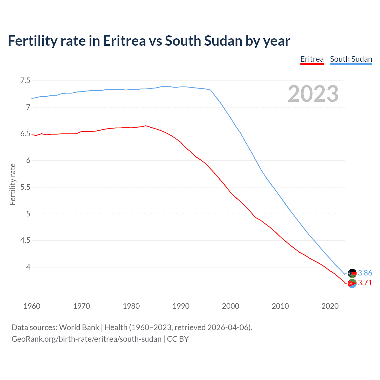 1960 vs 2023, the fertility rate has decreased by 42.7% in Eritrea and by 46% in South Sudan — in 1960, it was 6.48 and 7.16, respectively.