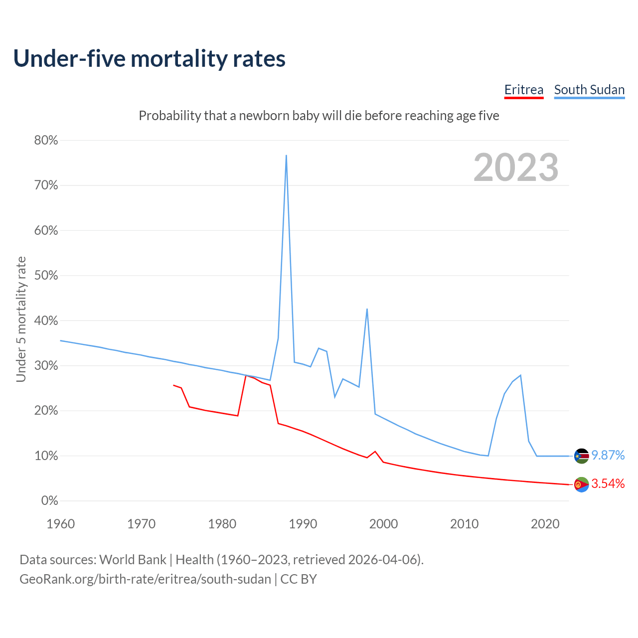 The chance that a newborn baby will die before reaching age five is 3.54% in Eritrea and 9.87% in South Sudan. Above is a chart with historical data on under-five mortality rates.