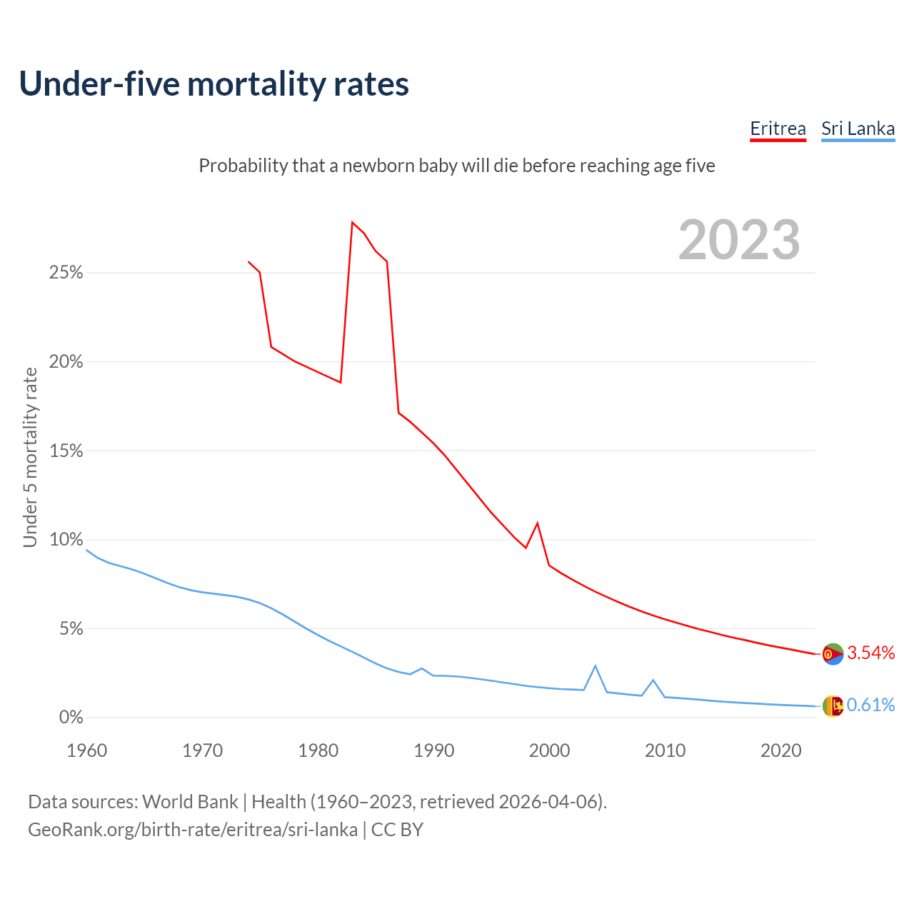 The chance that a newborn baby will die before reaching age five is 3.54% in Eritrea and 0.61% in Sri Lanka. Above is a chart with historical data on under-five mortality rates.