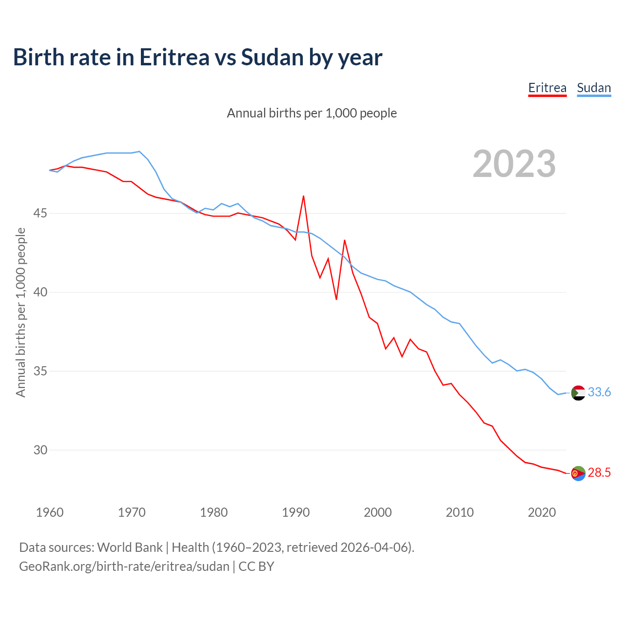 Eritrea has an annual birth rate of 28.5 births per 1,000 people, compared to 33.6 for Sudan. The average number of children a woman is expected to have during her lifetime — the fertility rate, is 3.71 in Eritrea and 4.32 in Sudan — 16.4% difference.
