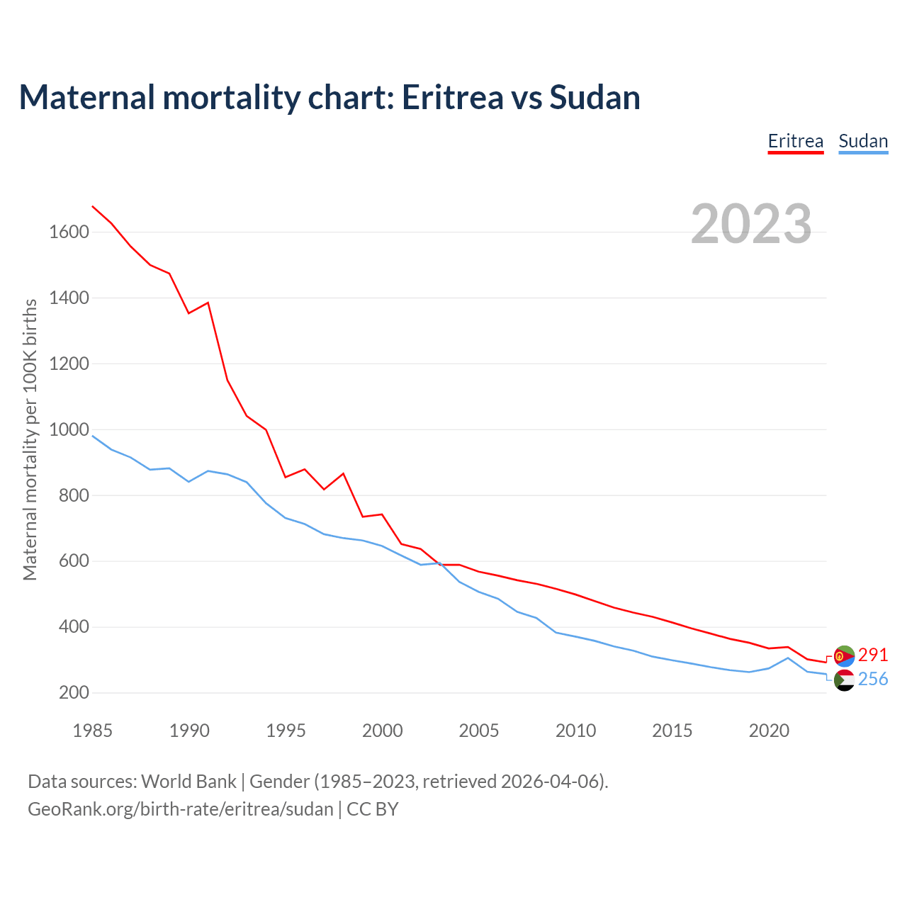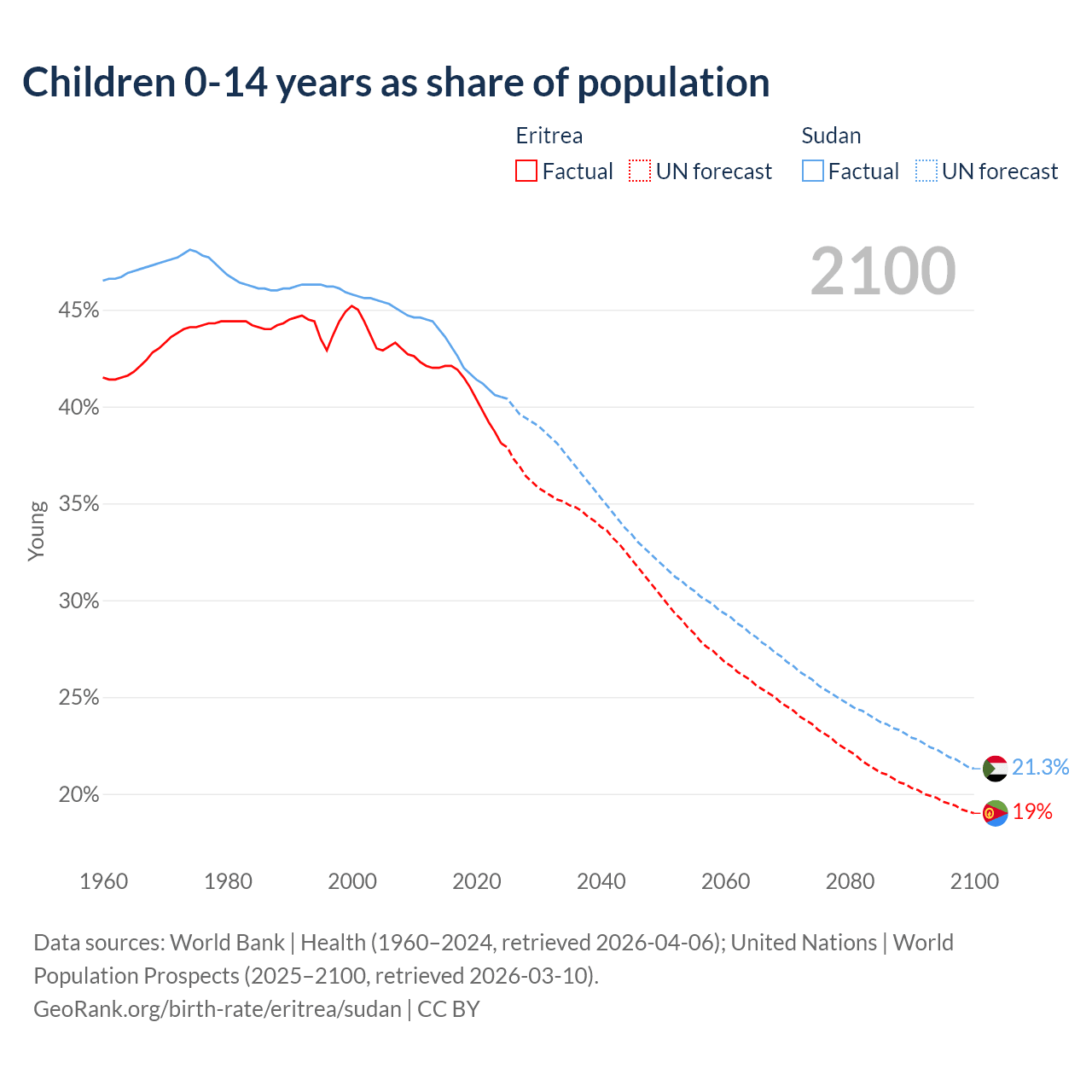 According to the latest available data on birth rates, the fertility rate in Eritrea was 3.71 children per woman in 2023, compared to 4.32 in Sudan in 2023. The replacement level is considered to be 2.1 children per woman.