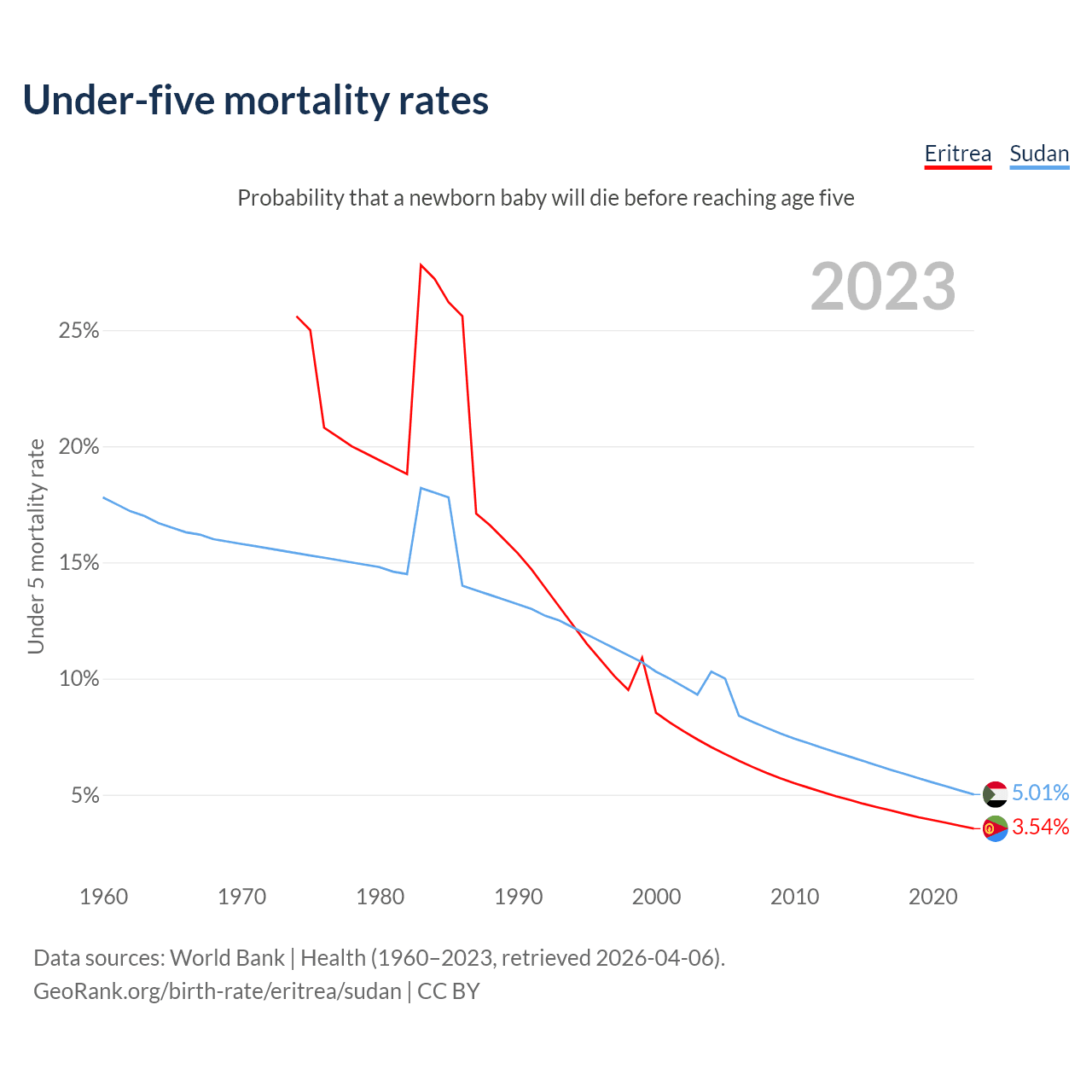 The chance that a newborn baby will die before reaching age five is 3.54% in Eritrea and 5.01% in Sudan. Above is a chart with historical data on under-five mortality rates.