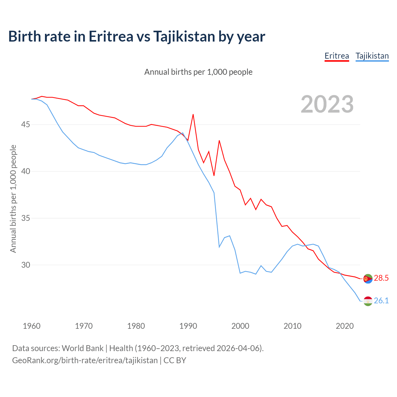 Eritrea has an annual birth rate of 28.5 births per 1,000 people, compared to 26.1 for Tajikistan. The average number of children a woman is expected to have during her lifetime — the fertility rate, is 3.71 in Eritrea and 3.07 in Tajikistan — 17.3% difference.