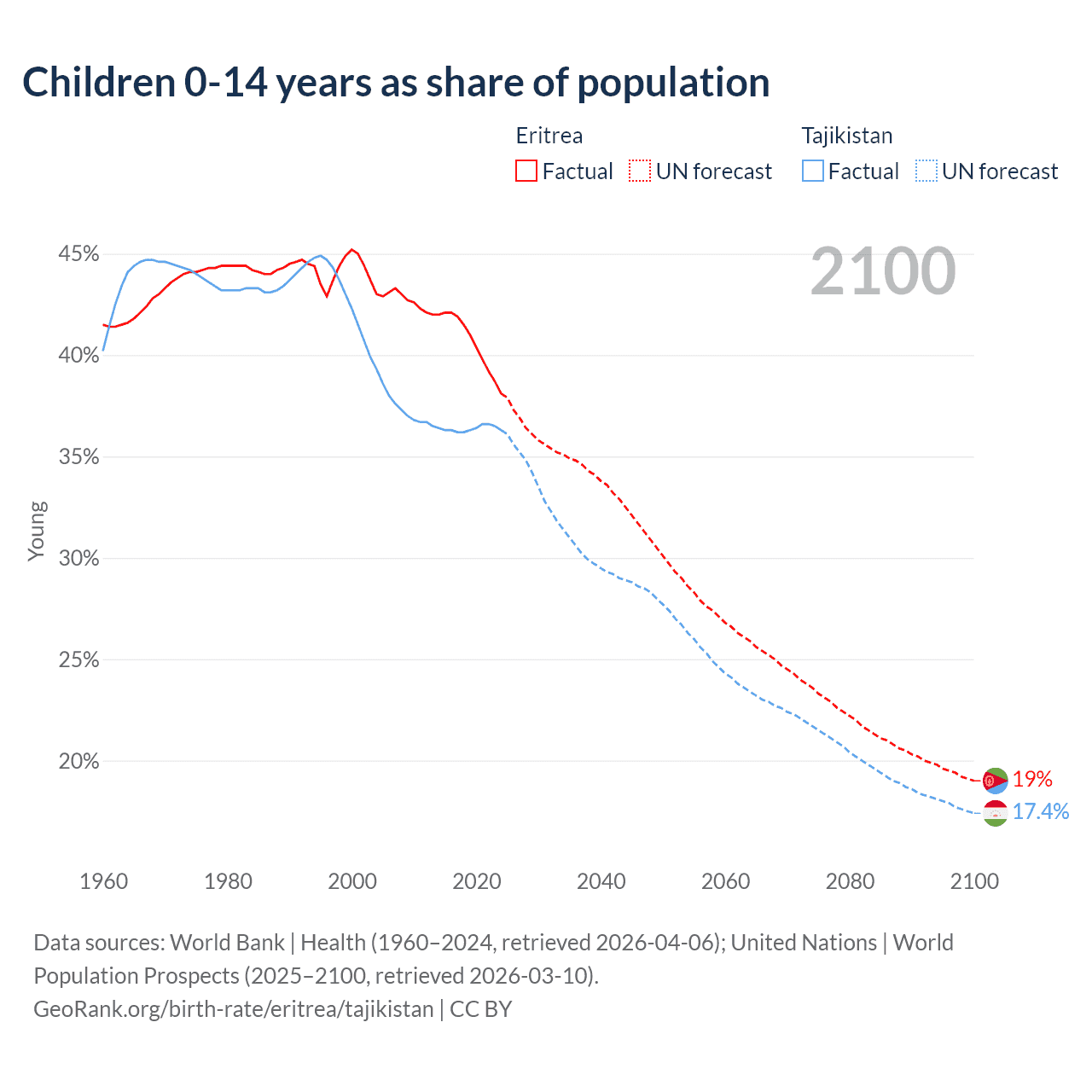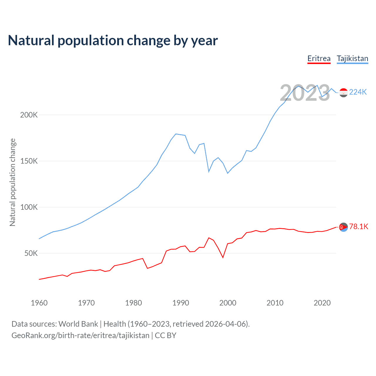 According to the latest available data on birth rates, the fertility rate in Eritrea was 3.71 children per woman in 2023, compared to 3.07 in Tajikistan in 2023. The replacement level is considered to be 2.1 children per woman.