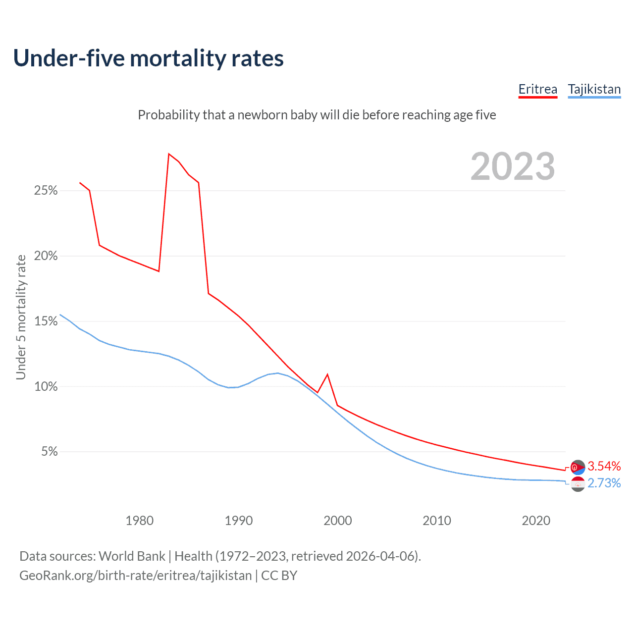 The chance that a newborn baby will die before reaching age five is 3.54% in Eritrea and 2.73% in Tajikistan. Above is a chart with historical data on under-five mortality rates.