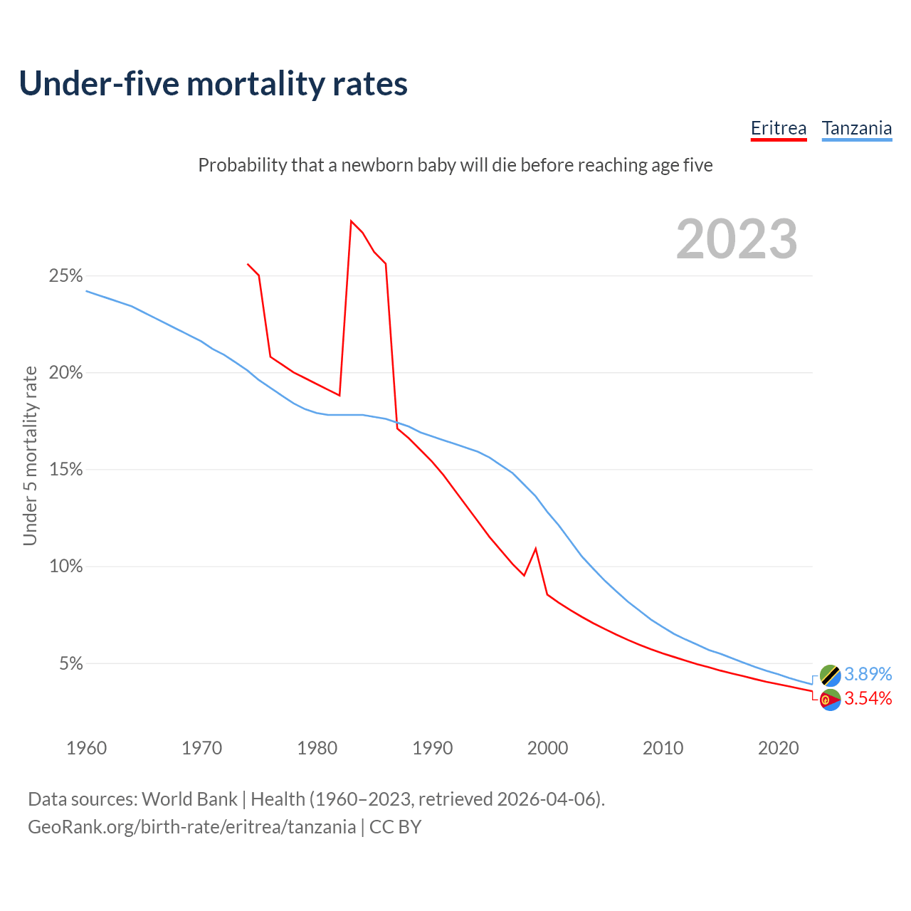 The chance that a newborn baby will die before reaching age five is 3.54% in Eritrea and 3.89% in Tanzania. Above is a chart with historical data on under-five mortality rates.