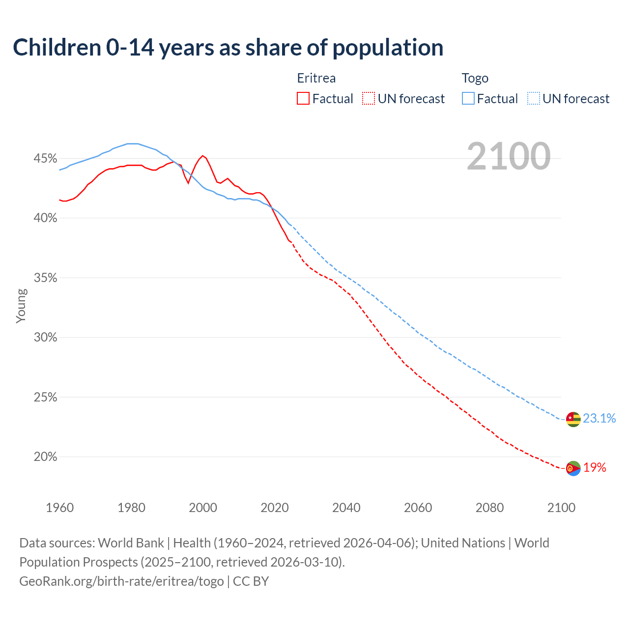 According to the latest available data on birth rates, the fertility rate in Eritrea was 3.71 children per woman in 2023, compared to 4.19 in Togo in 2023. The replacement level is considered to be 2.1 children per woman.