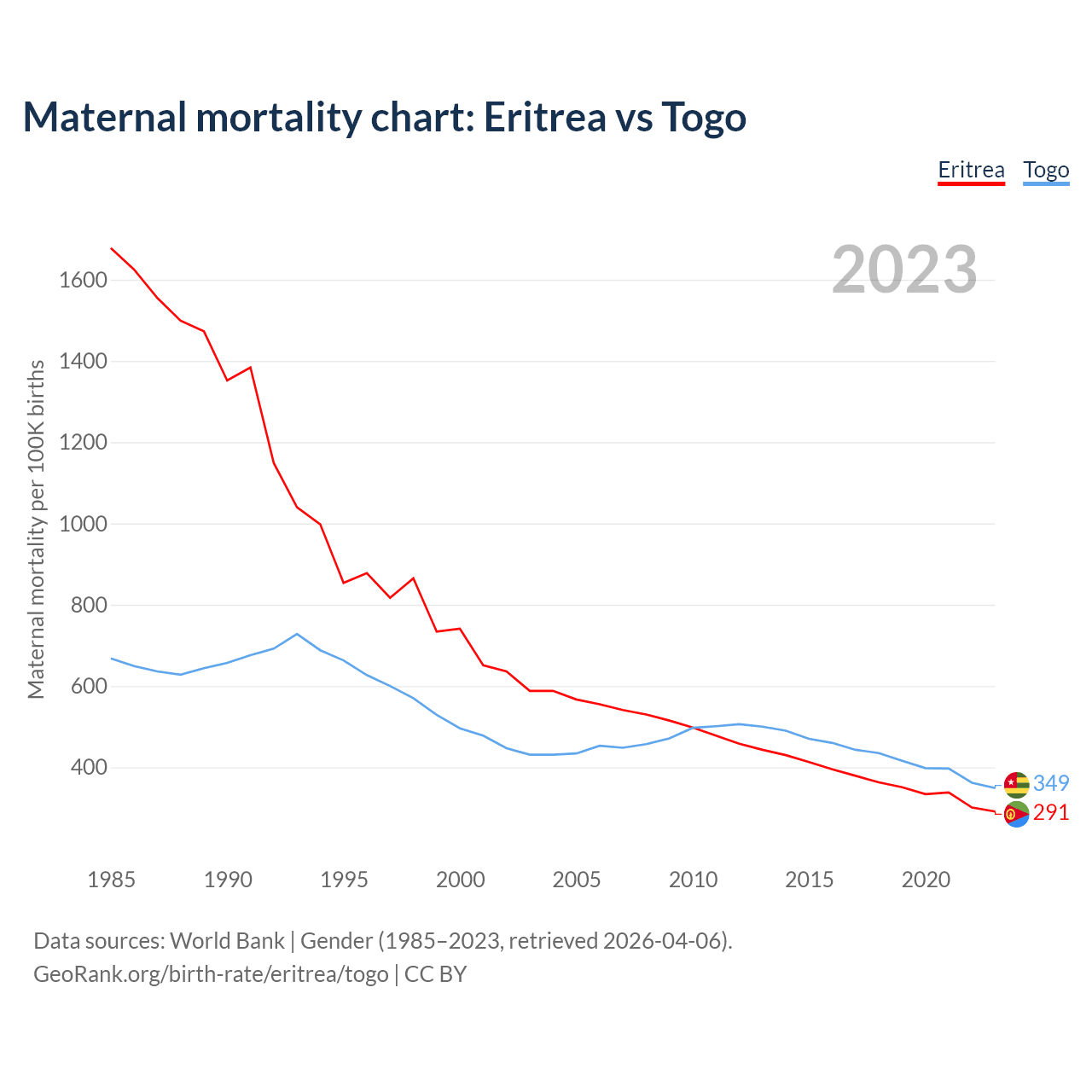 Eritrea has an annual birth rate of 28.5 births per 1,000 people, compared to 31.1 for Togo. The average number of children a woman is expected to have during her lifetime — the fertility rate, is 3.71 in Eritrea and 4.19 in Togo — 12.9% difference.