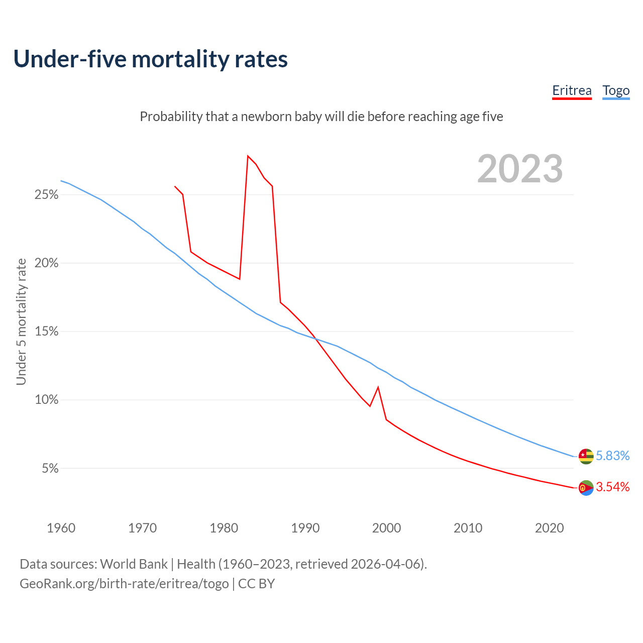 The chance that a newborn baby will die before reaching age five is 3.54% in Eritrea and 5.83% in Togo. Above is a chart with historical data on under-five mortality rates.