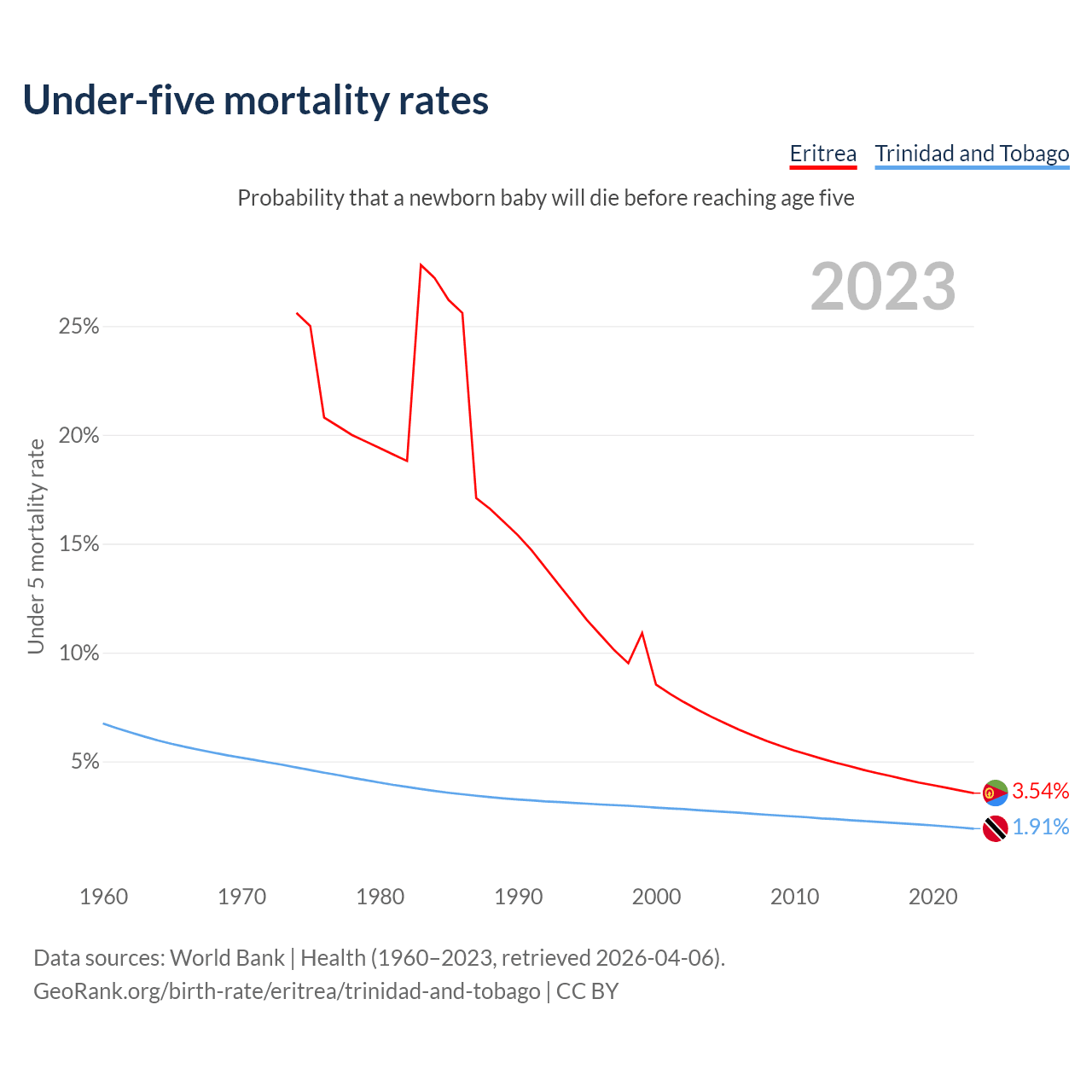 The chance that a newborn baby will die before reaching age five is 3.54% in Eritrea and 1.91% in Trinidad and Tobago. Above is a chart with historical data on under-five mortality rates.