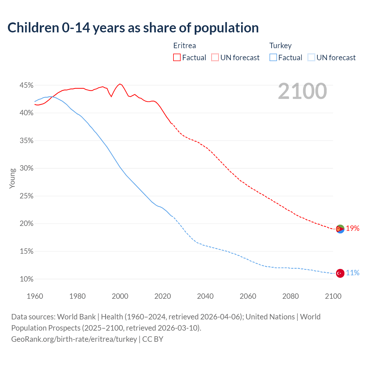 Eritrea has an annual birth rate of 28.5 births per 1,000 people, compared to 11.2 for Turkey. The average number of children a woman is expected to have during her lifetime — the fertility rate, is 3.71 in Eritrea and 1.51 in Turkey — 59.3% difference.