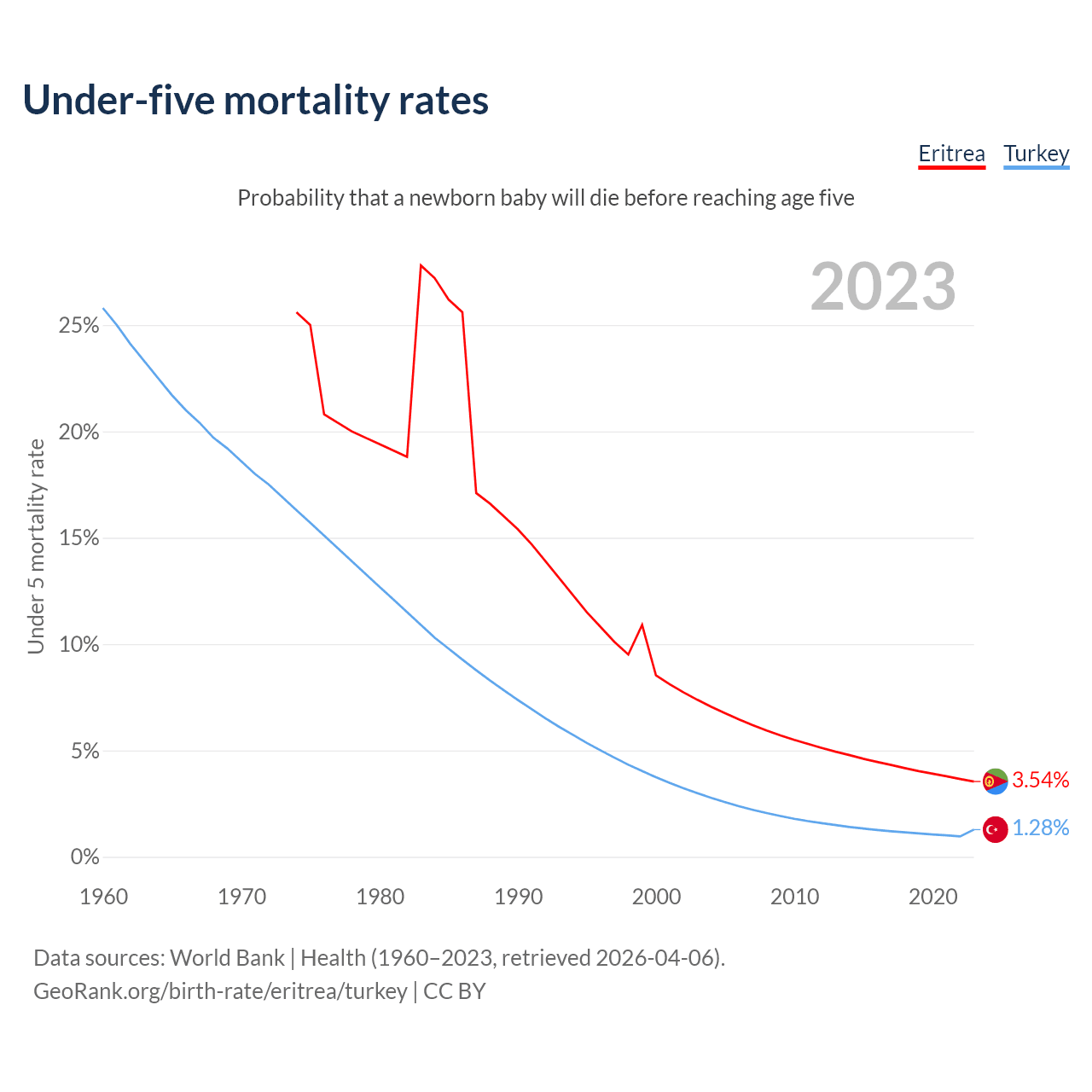 The chance that a newborn baby will die before reaching age five is 3.54% in Eritrea and 1.28% in Turkey. Above is a chart with historical data on under-five mortality rates.