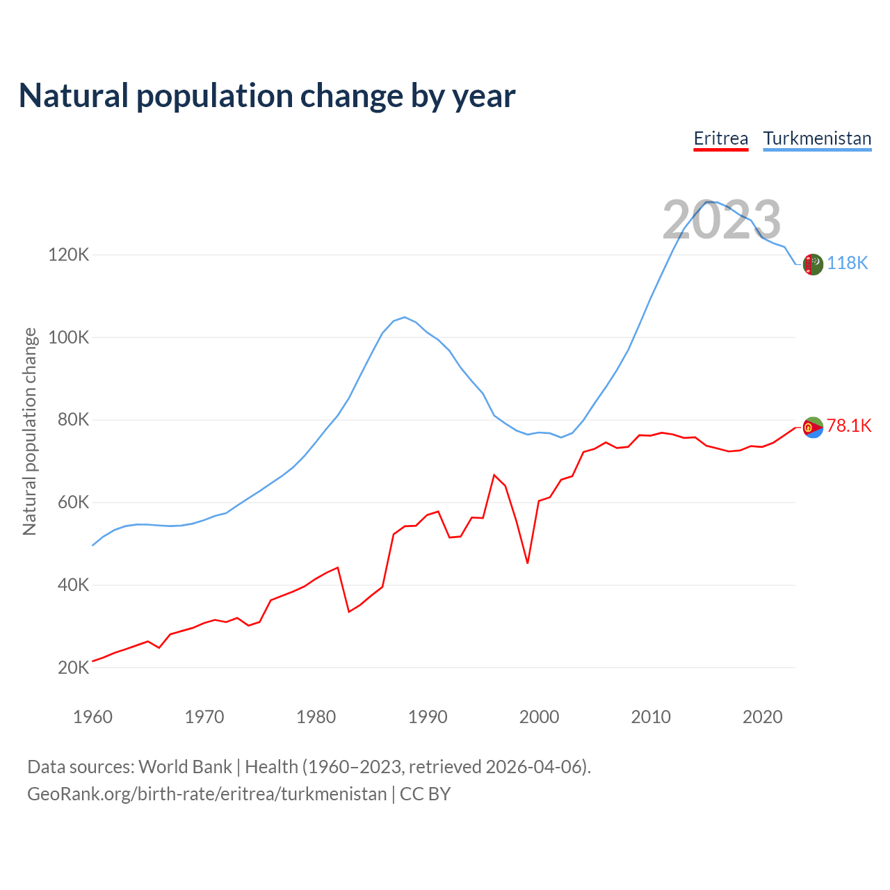 Eritrea has an annual birth rate of 28.5 births per 1,000 people, compared to 21.7 for Turkmenistan. The average number of children a woman is expected to have during her lifetime — the fertility rate, is 3.71 in Eritrea and 2.69 in Turkmenistan — 27.6% difference.