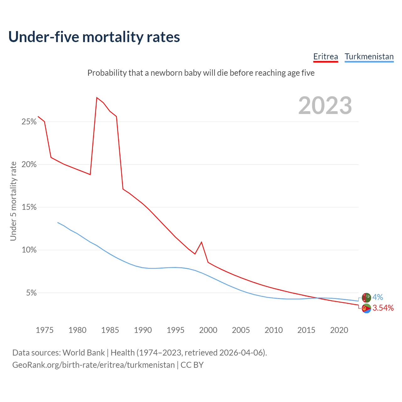 The chance that a newborn baby will die before reaching age five is 3.54% in Eritrea and 4% in Turkmenistan. Above is a chart with historical data on under-five mortality rates.