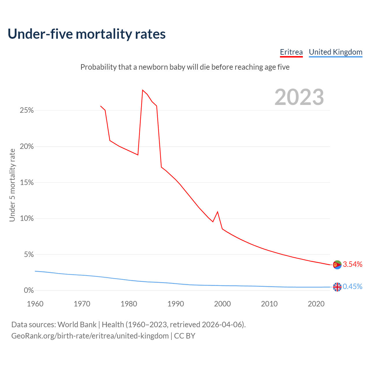 The chance that a newborn baby will die before reaching age five is 3.54% in Eritrea and 0.45% in the United Kingdom. Above is a chart with historical data on under-five mortality rates.