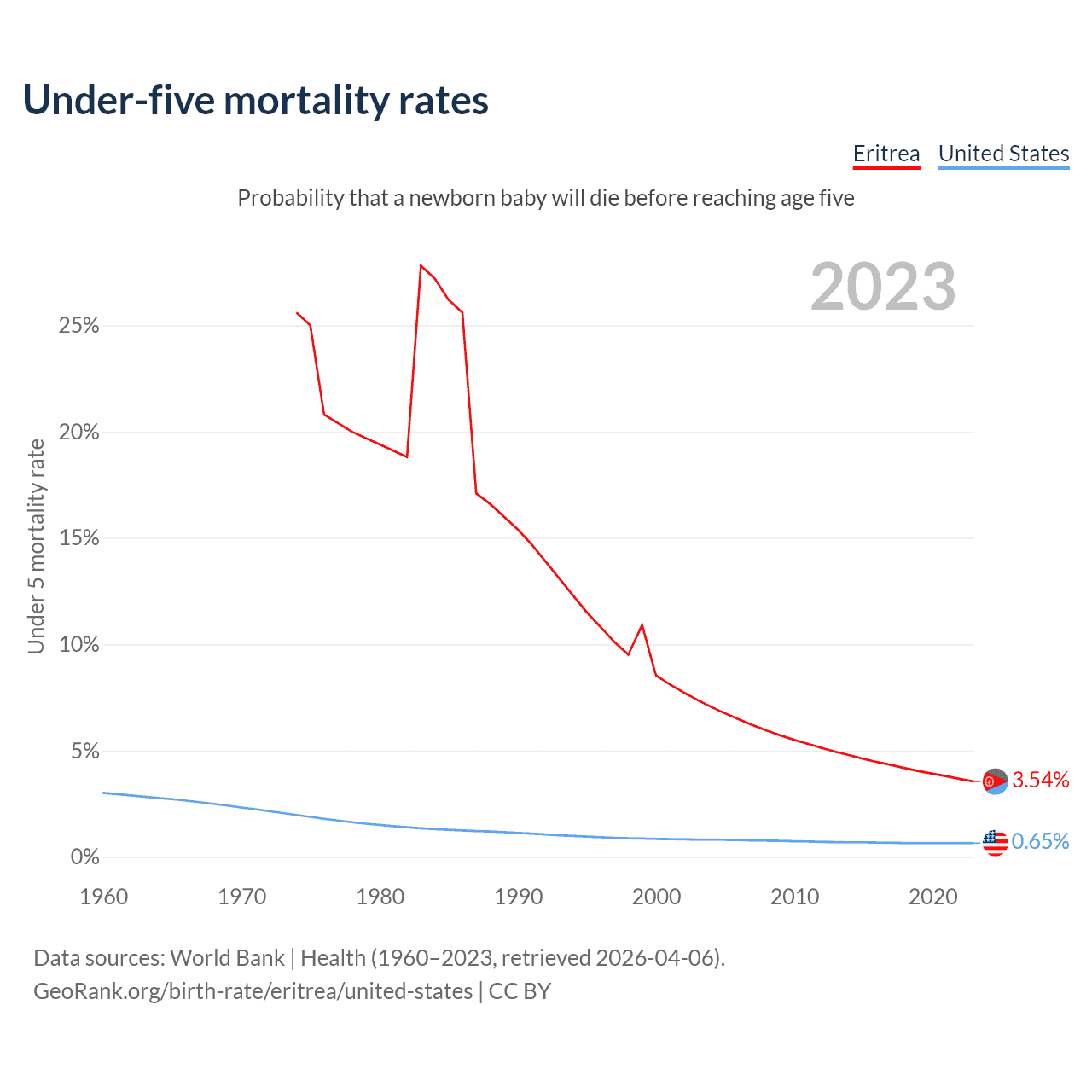 The chance that a newborn baby will die before reaching age five is 3.54% in Eritrea and 0.65% in the United States. Above is a chart with historical data on under-five mortality rates.